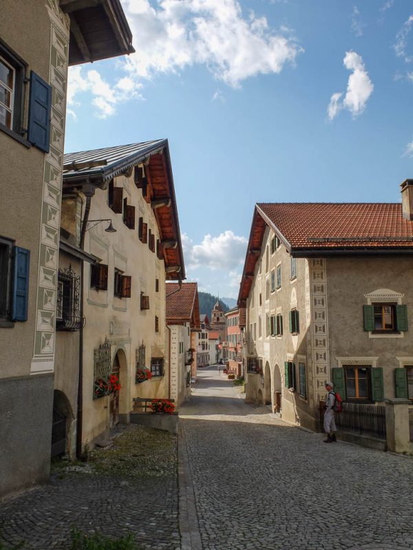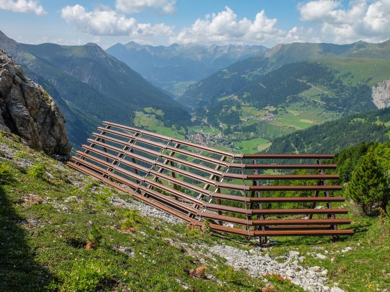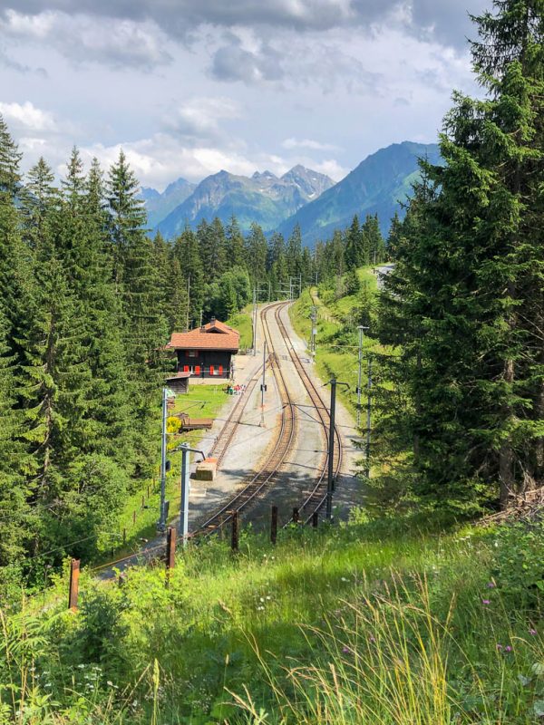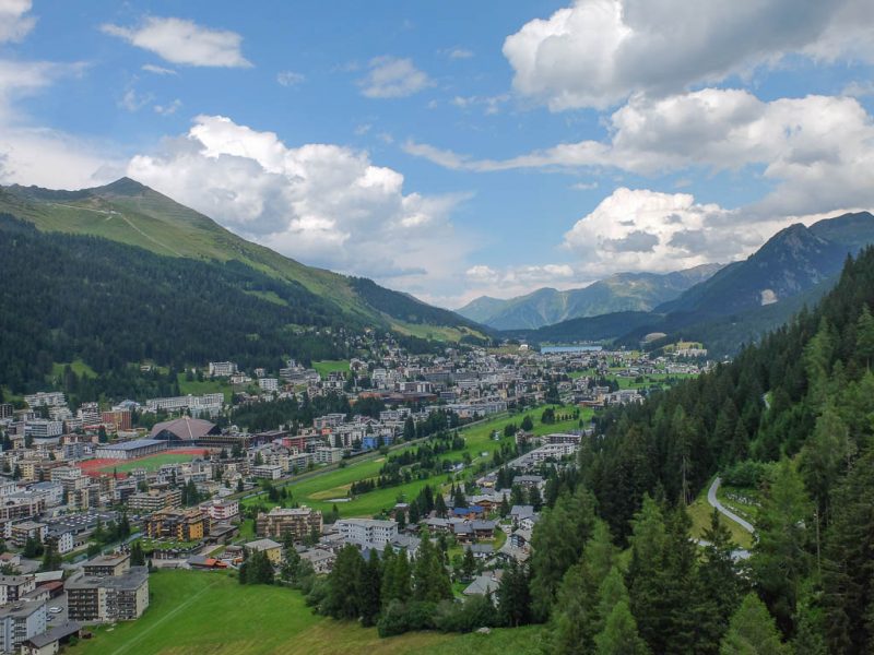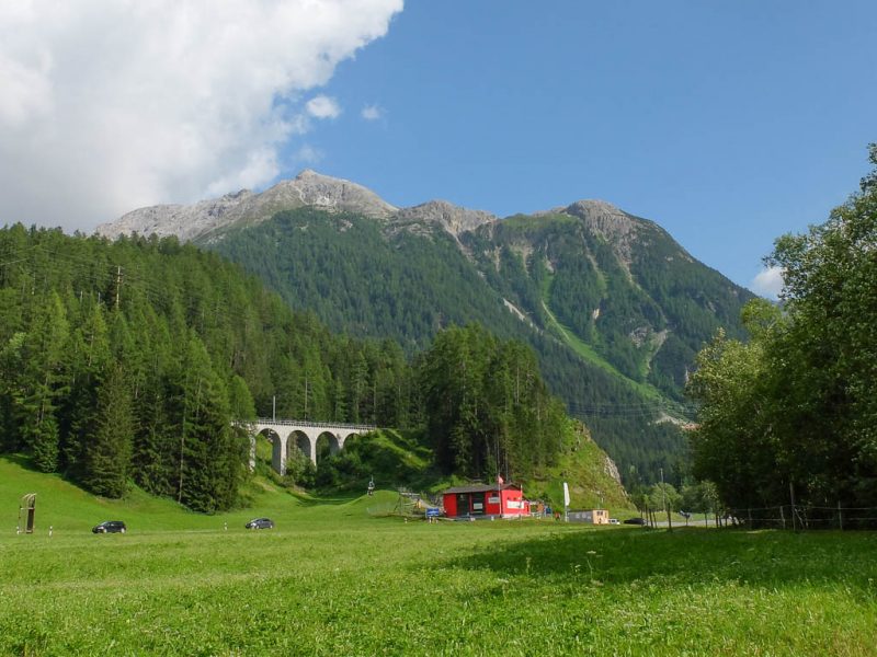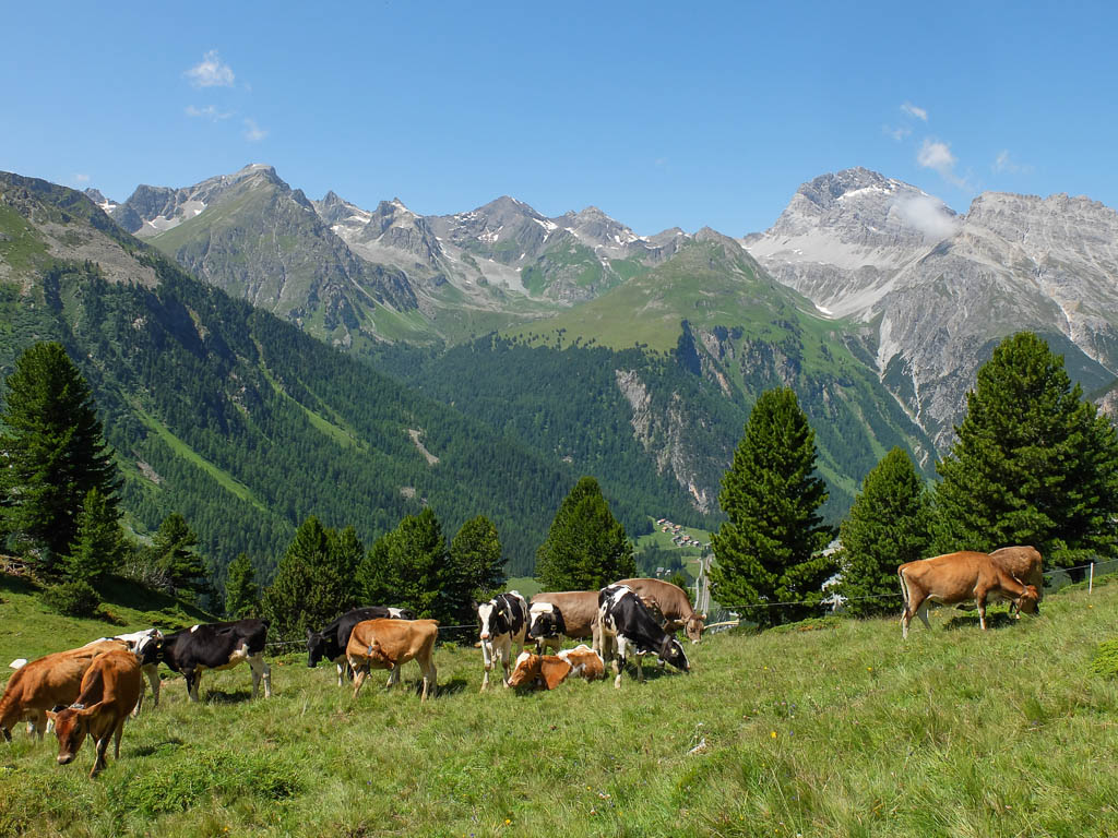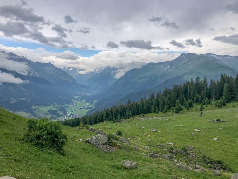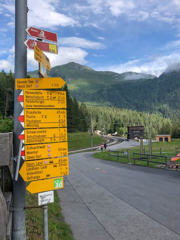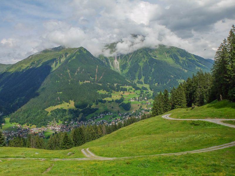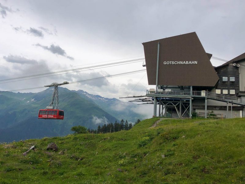 Den Regen bekommen wir während der Fahrt von der Gipfelstation zur Mittelstation nicht zu spüren, die Gondel ist zwar alt, aber wasserdicht! Spürbar ist allerdings der Wind, die Gondel schwankt einige Mal ziemlich heftig. Mit einer neueren und deutlich größeren Gondel geht es dann von der Mittelstation hinunter ins Tal. Als wir unten ankommen, trauen wir unseren Augen kaum: Die Regenwolken sind verschwunden und über Jatz- und Jakobshorn spannt sich ein strahlend blauer Himmel. Wir haben Juli, aber vom Wetter her meint man, wir seien im April!