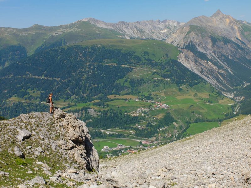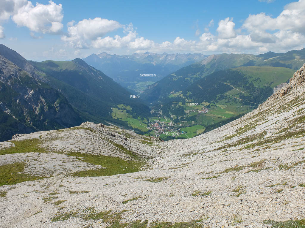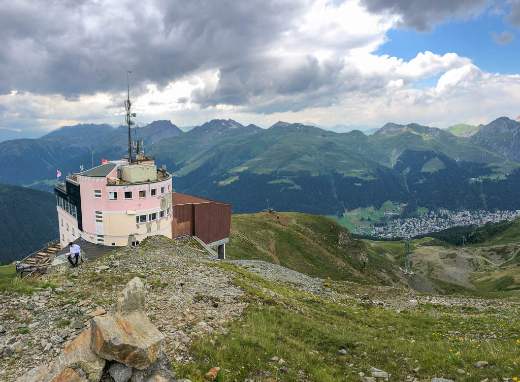 Geplant ist eine Gratwanderung vom Jakobs- zum Jatzhorn und der anschließende Abstieg hinunter ins Sertigtal. Vom Sertigtal aus wollen wir dann mit dem Bus zurück nach Hause fahren. Als wir die Gipfelstation erreichen ist soweit noch alles okay: Wir gehen die paar Schritte hinauf zum Gipfel des Jakobshorns und genießen dort die Aussicht. Der Blick zur Gipfelstation, im Tal ist Davos zu sehen: