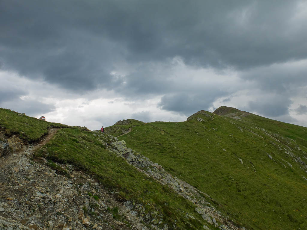 Ebenfalls zu sehen sind dicke, schwarze Wolken, dabei soll es laut Wetterbericht in den nächsten Stunden rund um Davos trocken bleiben. Während wir uns dem Jatzhorn aus nördlicher Richtung nähern, rücken die südlich liegenden Wolken gleichfalls Richtung Jatzhorn vor. In der Nähe des Gipfels fallen die ersten Tropfen: