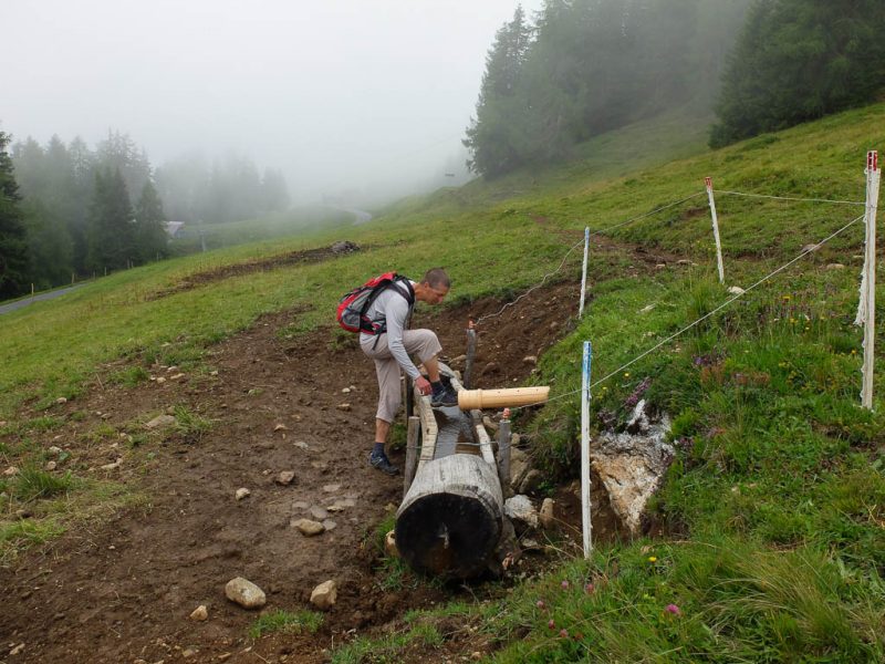Während ich weiter nach einer geeigneten Stelle zum Überqueren des Bachs suche, versucht Guido, den demolierte Holzsteg in Richtung Bachbett zu schieben. Ich kehre daher an diese Stelle zurück und helfe Guido bei seinen Bemühungen: Ich bekomme das Ende des Holzstegs zu fassen und kann es so deponieren, dass es einigermaßen sicher liegt und ich den Bach auf dem Steg überqueren kann.