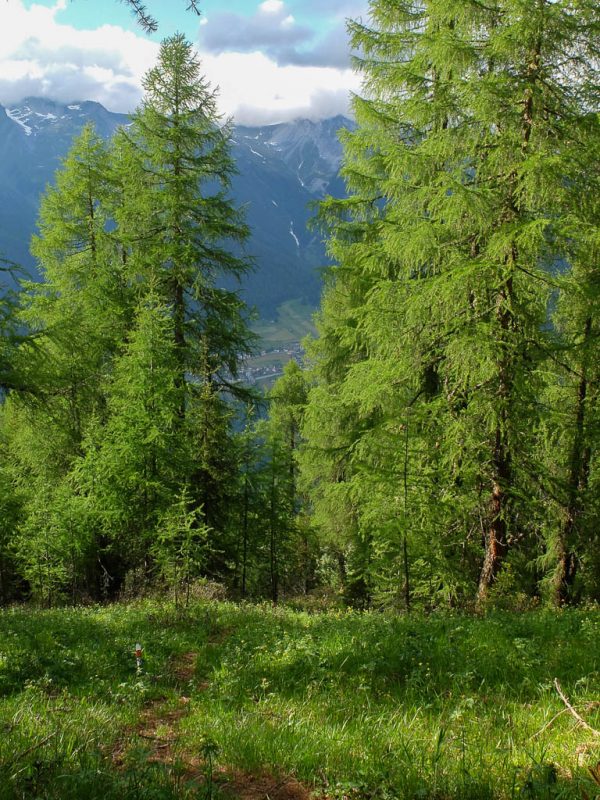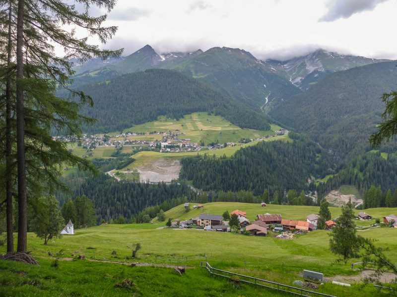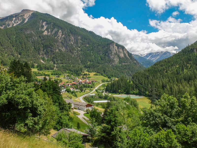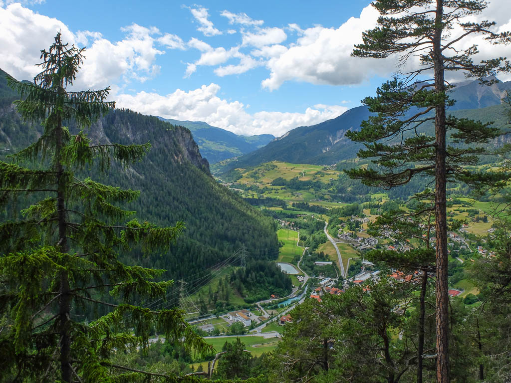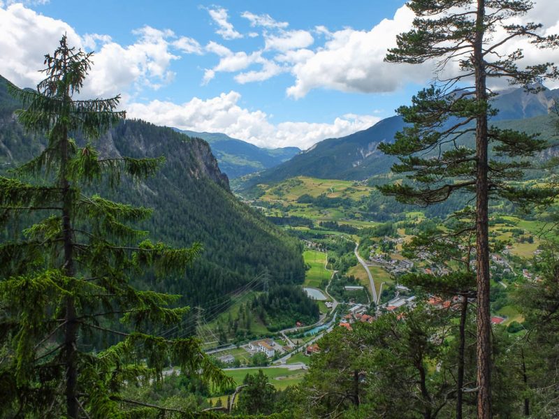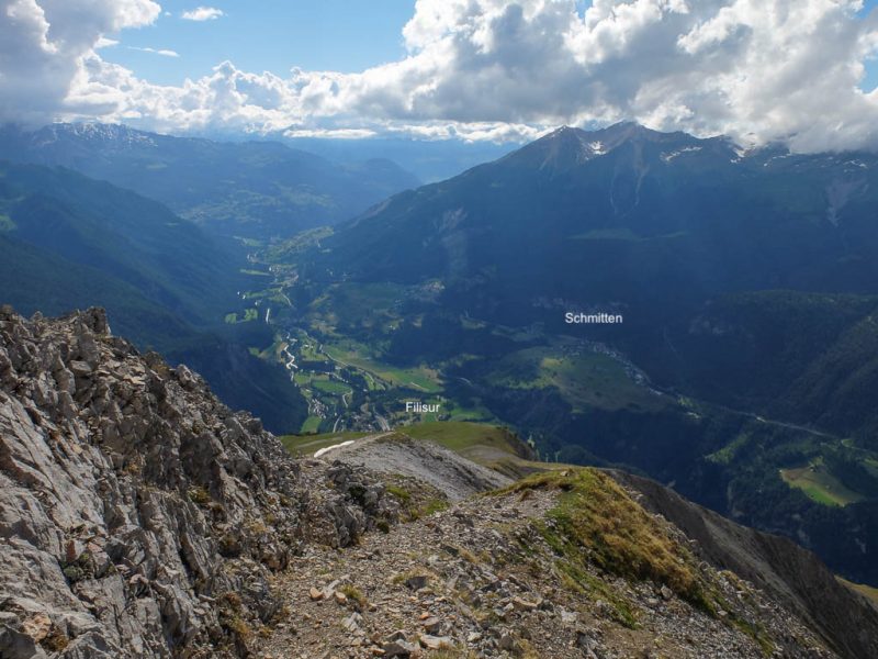 Der Blick vom Fahrweg hinab nach Filisur und über das Albulatal: