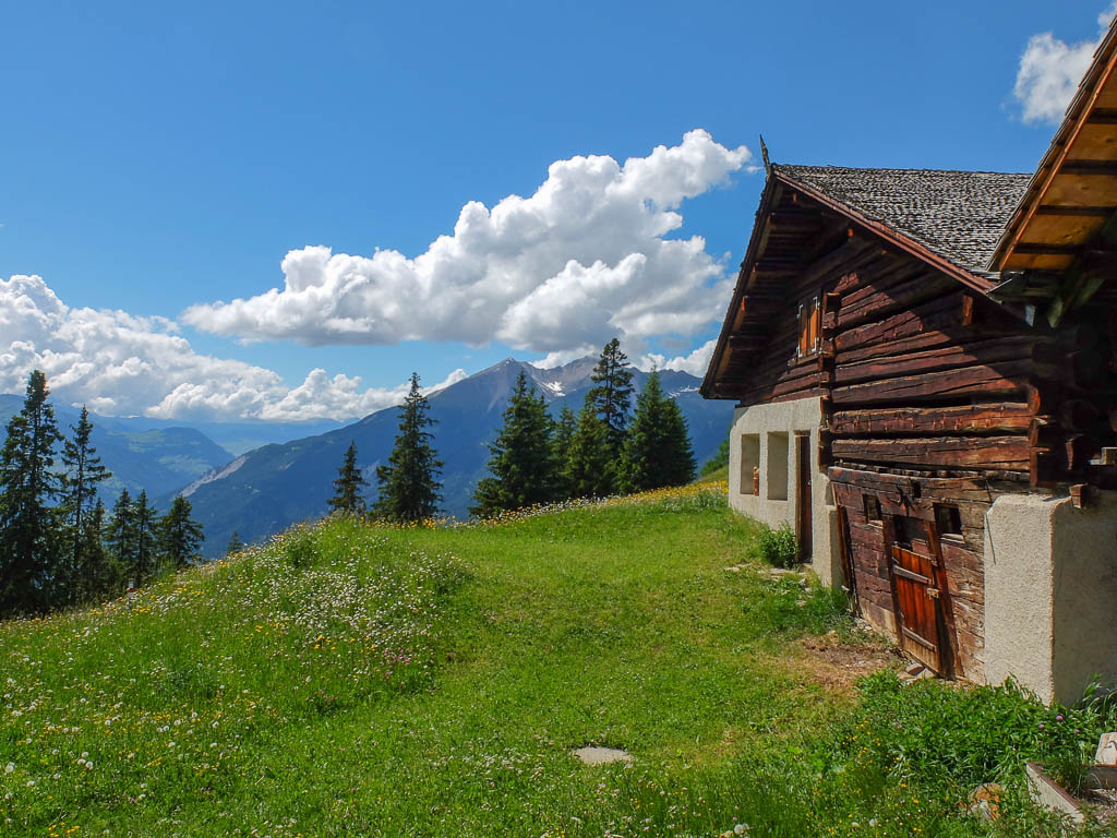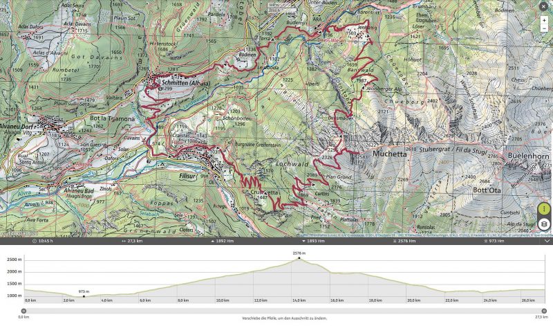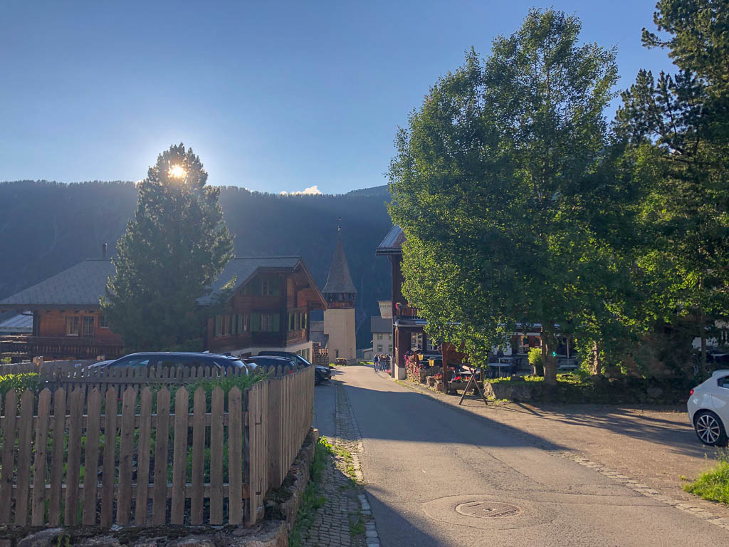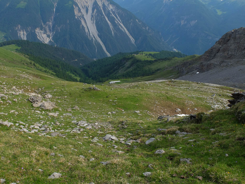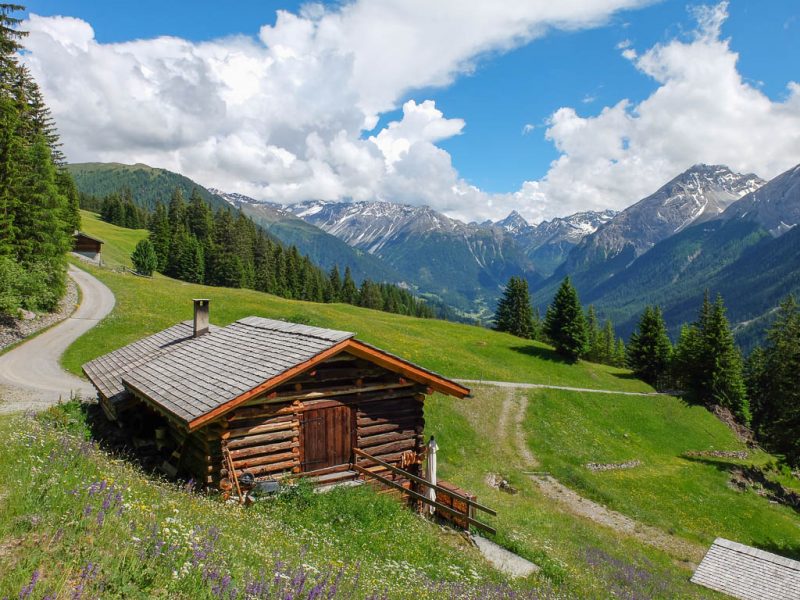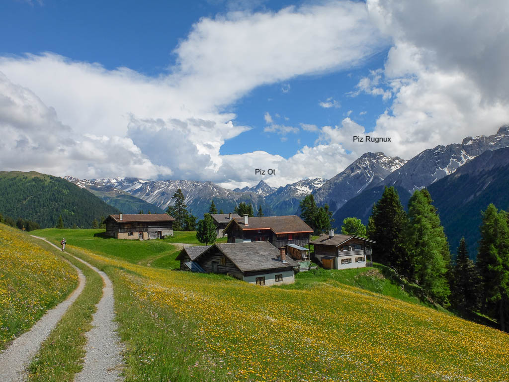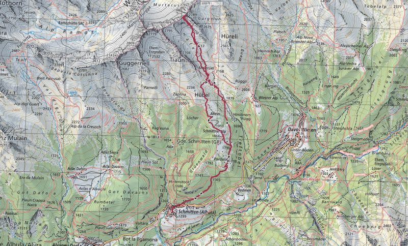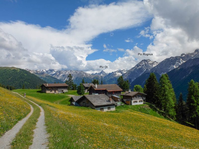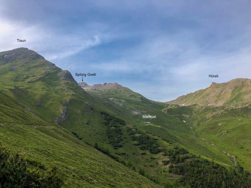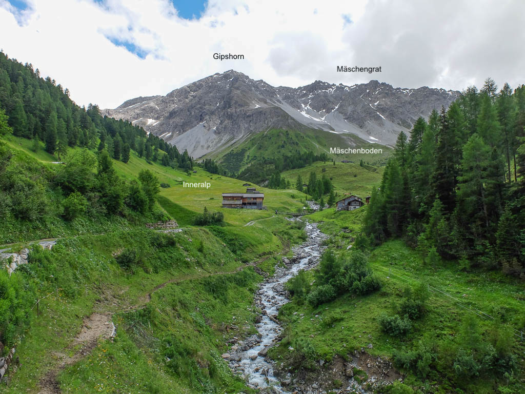 Das Wetter der ersten Tageshälfte: Der Himmel ist bewölkt, die Temperaturen sind mild und nur ab und zu kommt die Sonne heraus. Das Wetter ist also perfekt für eine Bergwanderung. Als Ziele kommen heute der Guggernellgrat und das Büelenhorn in Frage. Da das Steilgras am Guggernell aufgrund der Regenfälle der letzten Tage noch ziemlich nass sein kann, entscheiden wir uns schlussendlich für das Büelenhorn. Das Büelenhorn ist ein Berg südlich von Davos Monstein. Zu den Nachbargipfeln gehören das Gipshorn im Osten und der Muchetta im Westen. Start unserer Tour ist ein Parkplatz am unteren Dorfrand von Monstein. Von dort aus geht es durch Monstein hindurch und dann weiter über Alpstraßen hinauf zu den Hütten von Unteralp, Inneralp und Mäschenboden: