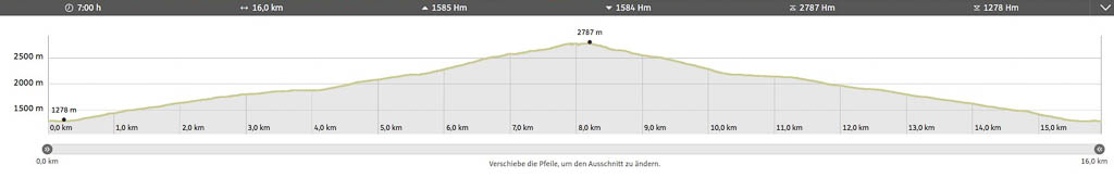 Gut fünf Stunden brauchen wir für Auf- und Abstieg, die Streckenlänge beträgt 15,5 Kilometer. Dabei sind 1200 Höhenmeter zu überwinden.