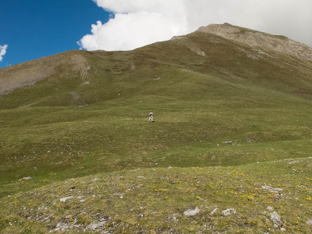 Von Mäschenboden aus führt ein schmaler, rot-weiß gekennzeichneter Wanderweg hinauf zum Büelenhorn: