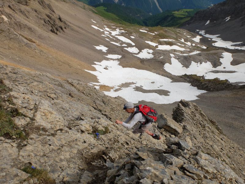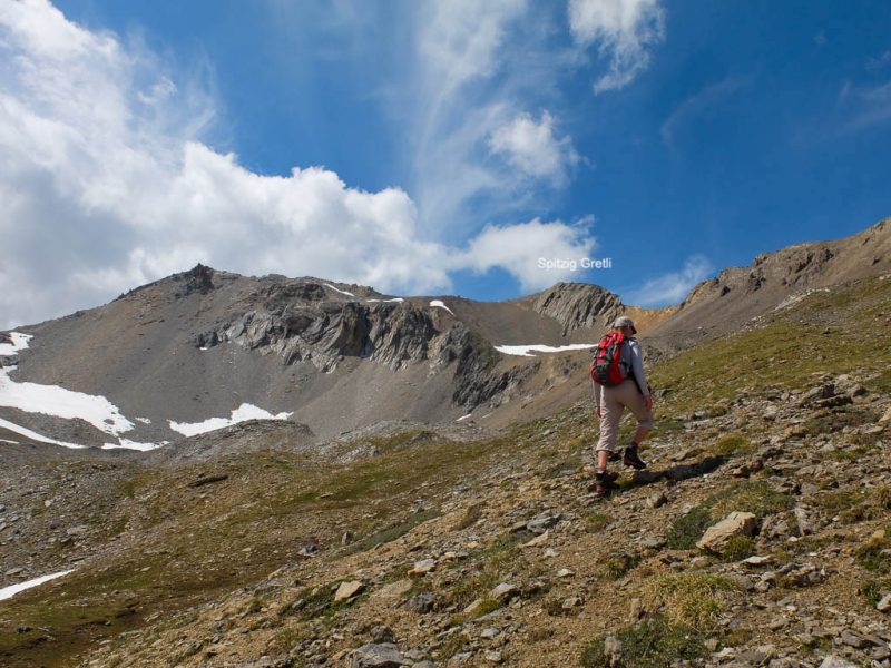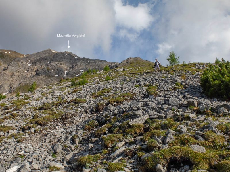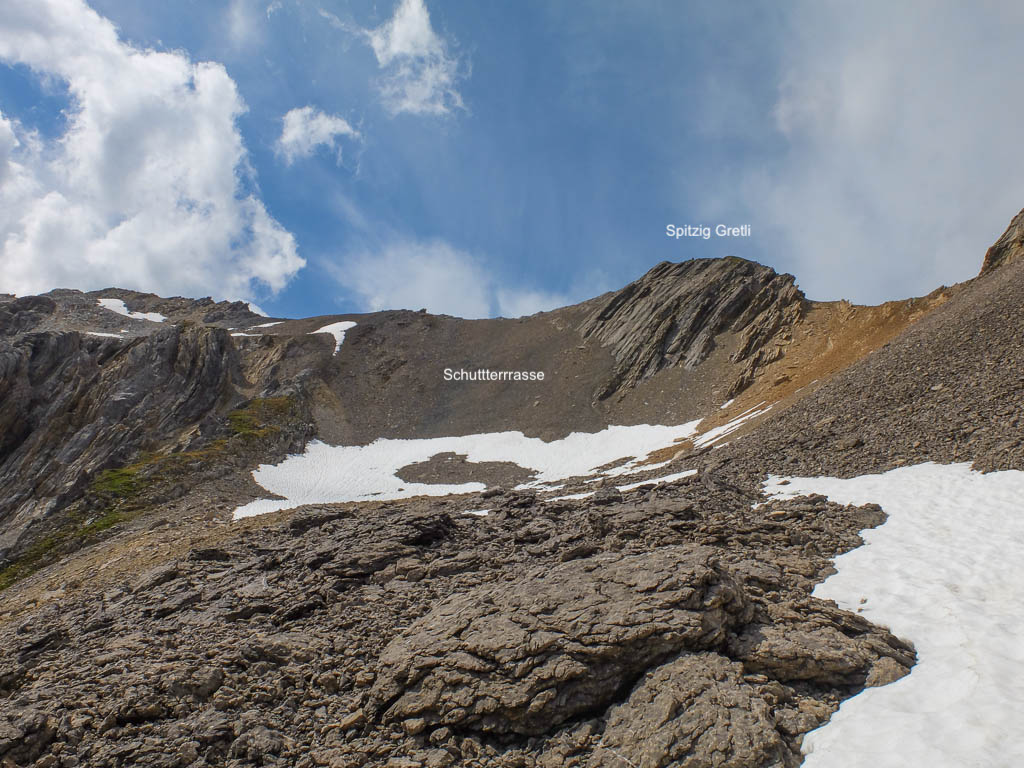 Ab 2550 Meter wird der Weg steiler und es geht über Schutt weiter. Besondere Schwierigkeiten sind dabei allerdings nicht zu überwinden. Gut zweieinhalb Stunden nach dem Beginn unserer Tour stehen bzw. sitzen wir schließlich auf dem Gipfel des Büelenhorns: