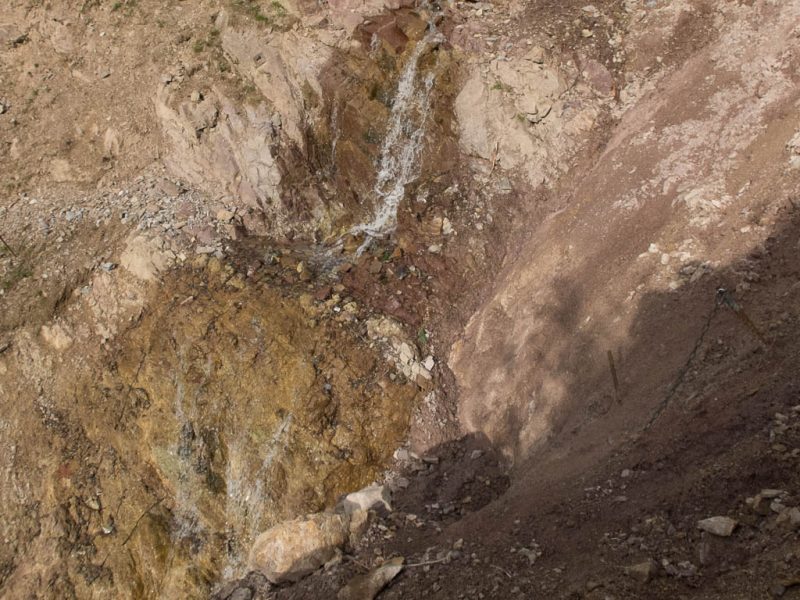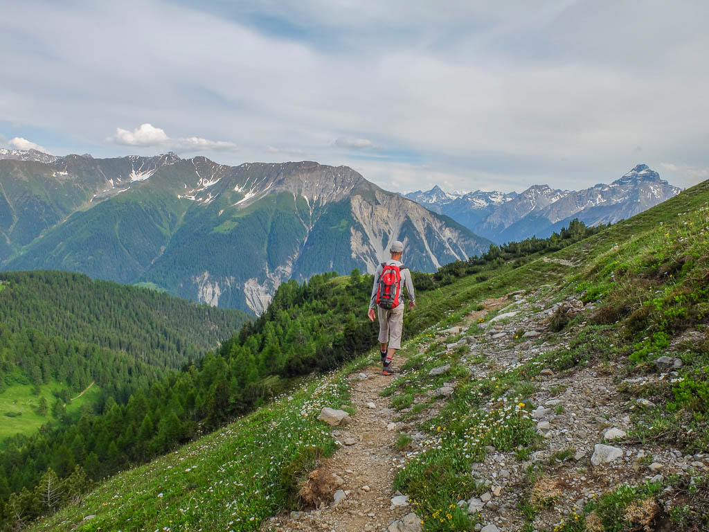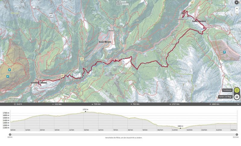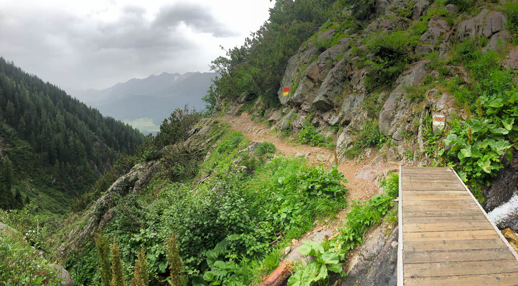 Die meisten Wanderer sind wegen des vorhergesagten Regenwetters aber schon wieder auf dem Nachhauseweg oder aber auf dem Weg in eine Gaststube. Auf dem Weg von Monstein nach Jenisberg sind wir jedenfalls wieder allein unterwegs. Der größte Teil dieses Wegabschnitts führt über einen schmalen Waldpfad entlang des Hangs, etwa 200 Meter über dem Landwassertal. Dabei sind etliche Tobel zu überqueren: