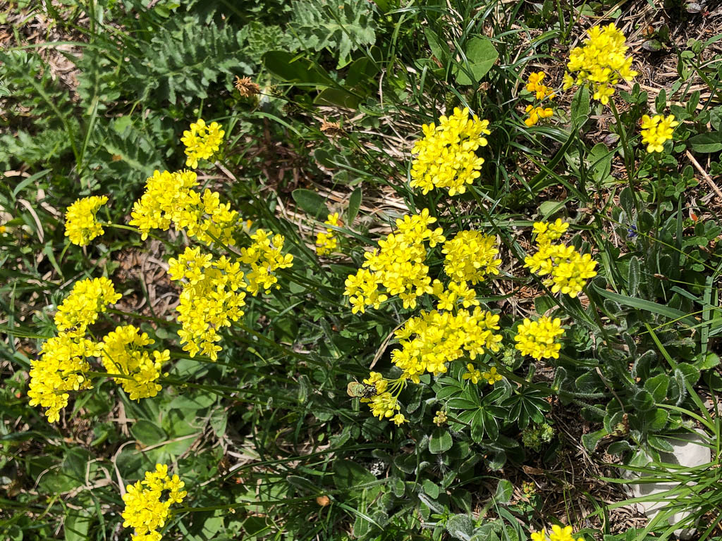 Auf die Idee, ein paar der Triebe mitzunehmen, komme ich, weil ich vor zwei Tagen ein Video über die Heilwirkung des Kletten-Labkrauts gesehen habe: Es soll einen positiven Einfluss auf die Lymphbahnen haben. Große Mengen kann ich davon nicht essen, aber als kleine Vorspeise zum Abendessen kann ich es durchaus genießen. Während der von 12 bis 17 Uhr stattfindenden Wanderung lasse ich mir außerdem Blüten vom Löwenzahn, junge Triebe vom Wiesenbocksbart und Blütenstände vom Brillenschötchen schmecken. Letzteres ist hier zu sehen: