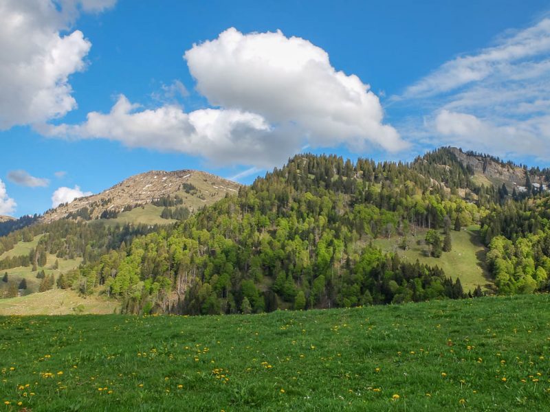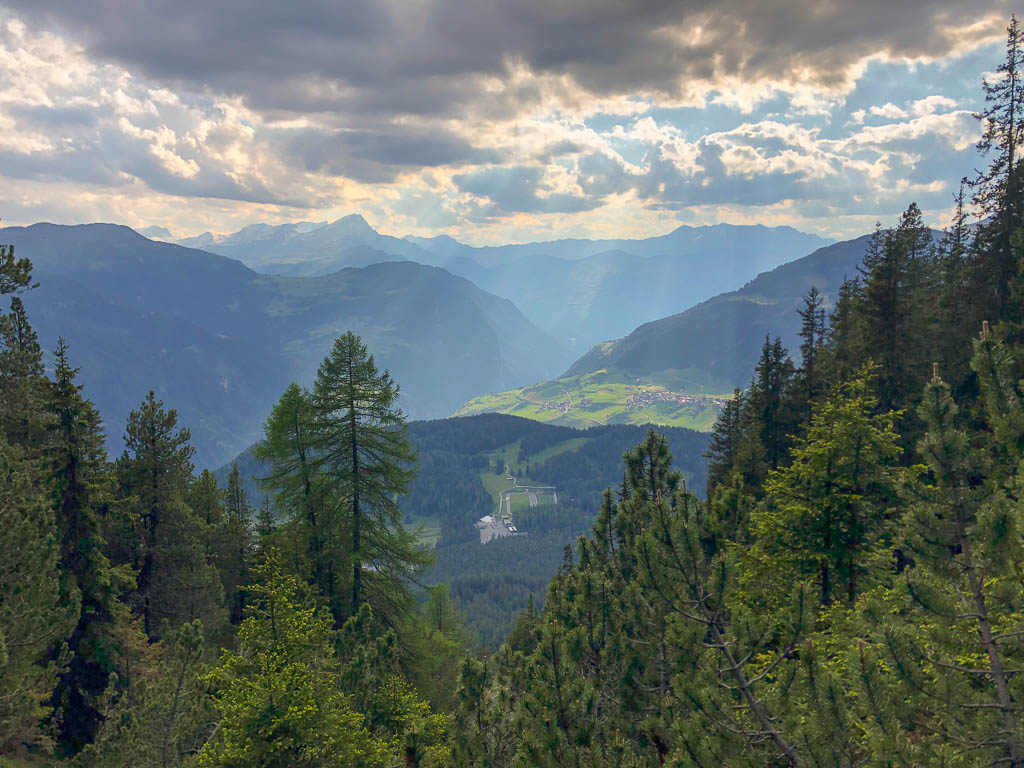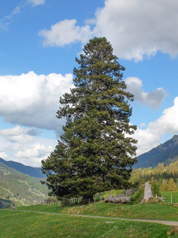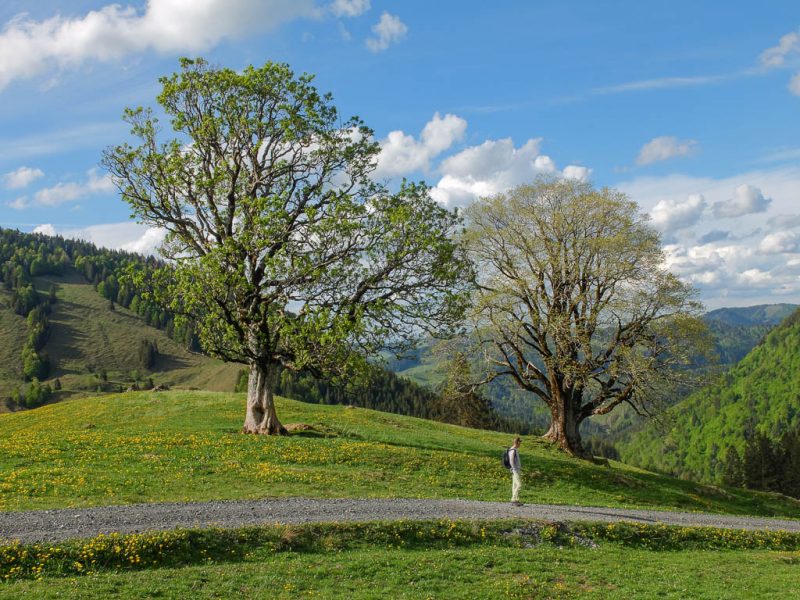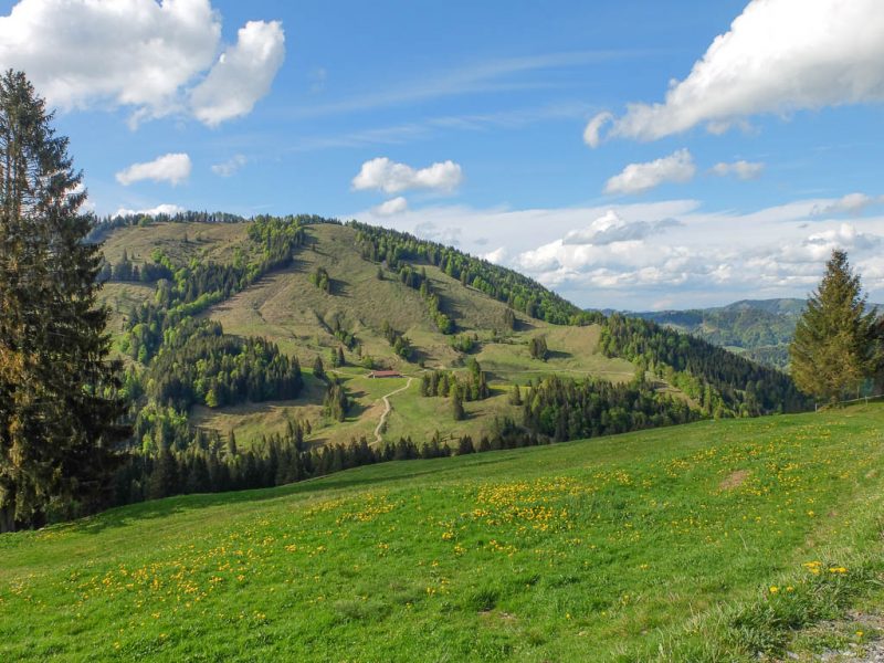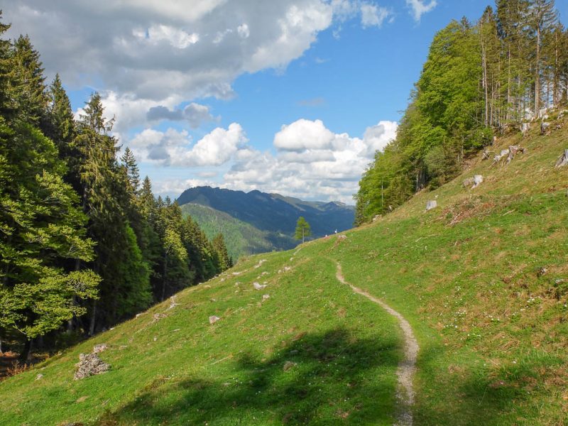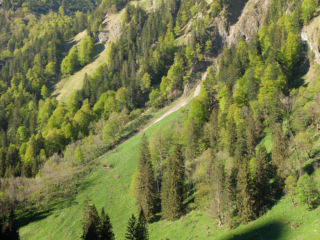 Gegen 17.30 Uhr machen wir uns auf den Abstieg. Von der Käser-Alpe aus kann Guido die steile Abfahrt genießen und ich den Abstieg zu Fuß. In diesem Bergwald sitzt irgendwo ein Kuckuck und macht sich durch lautes Rufen bemerkbar: