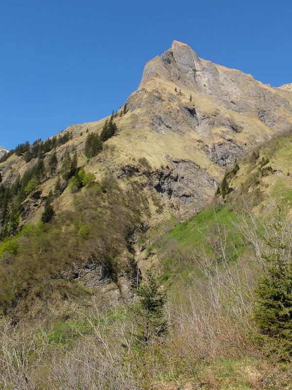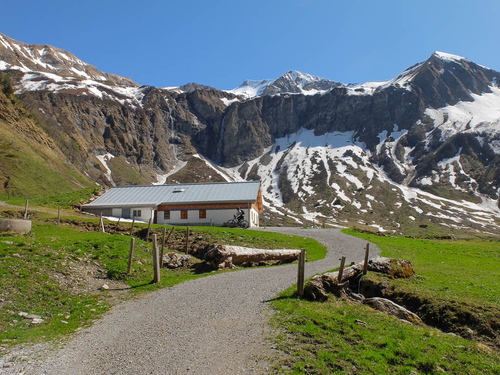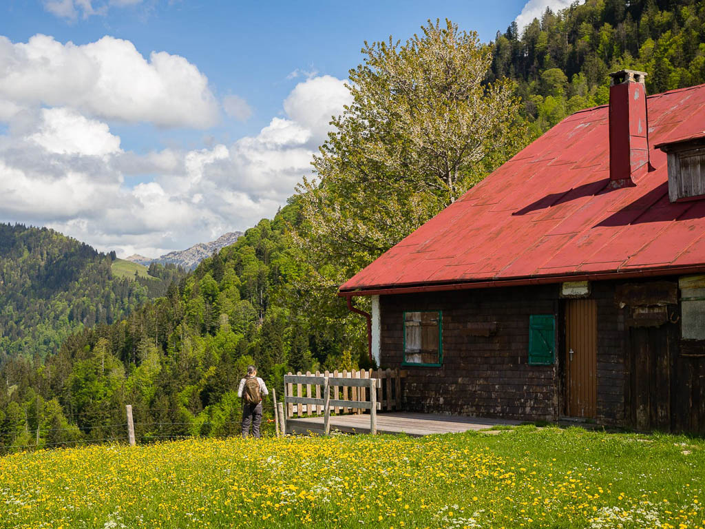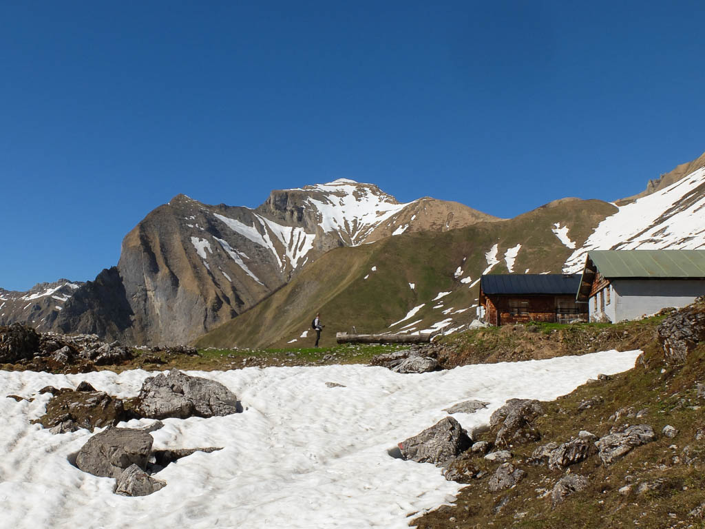 Von der Käser-Alpe aus erreichen wir nach gut einem Kilometer und fast 300 Höhenmetern die Wildenfeld-Hütte, hier mit Schneck im Hintergrund:
