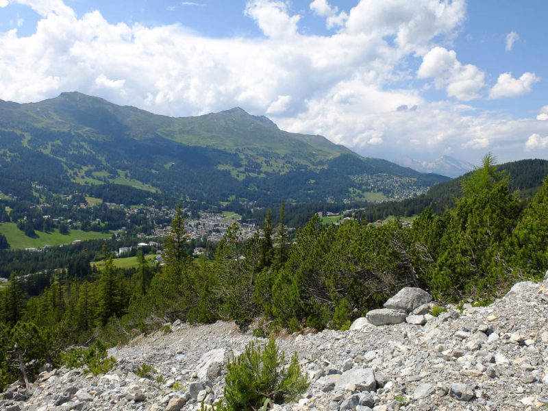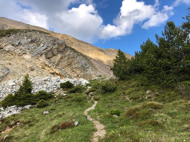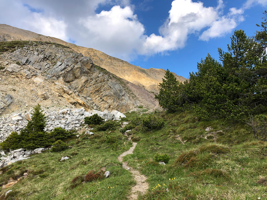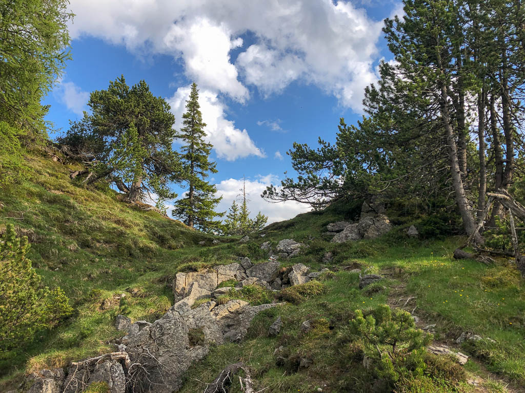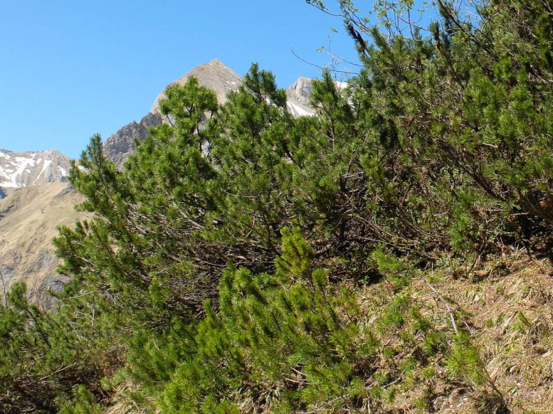 Hier parkt Guido sein Fahrrad und wir wandern zusammen hinauf zur Wildenfeld-Hütte. Latschenkiefern am Wegesrand: