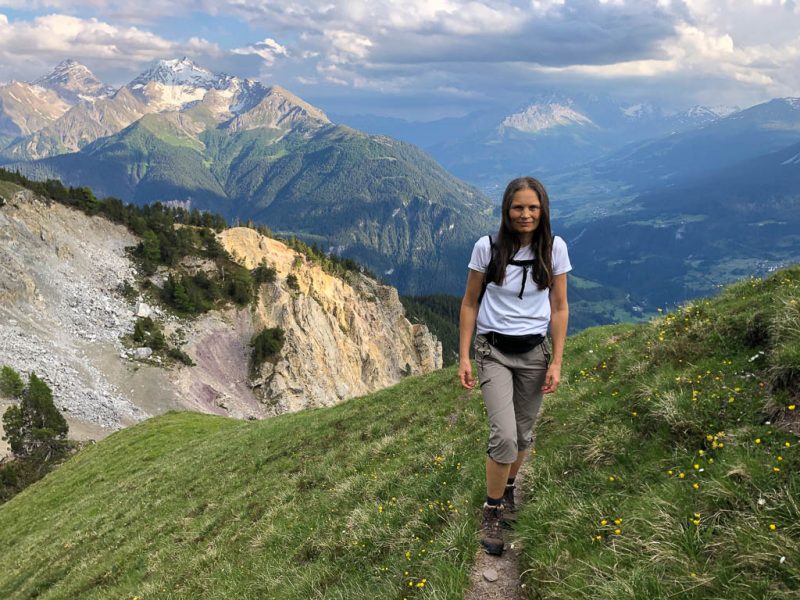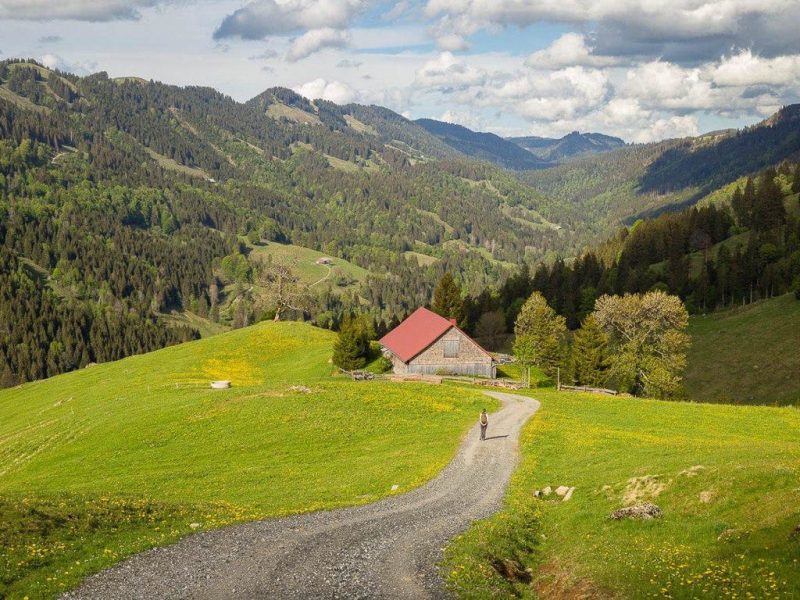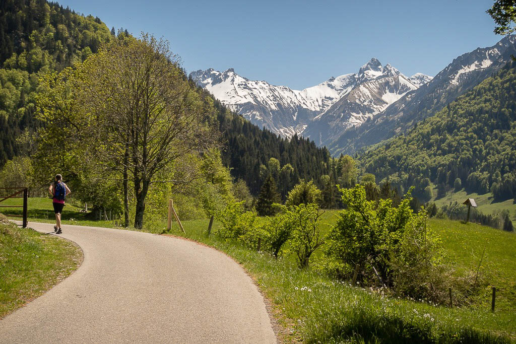 Wie erwartet, ist Oberstdorf weiterhin wie ausgestorben. Was uns aber überrascht, ist die Auskunft der Fahrradhändler, dass sie zwar Fahrräder reparieren und verkaufen können, aber nicht ausleihen. Nach Erhalt dieser unerfreulichen Nachricht bin ich kurz davor, mir Trailschuhe zu kaufen, damit ich, während Guido radelt, zügig neben ihm her joggen kann. Preise um die 150 Euro für ein Paar halten mich jedoch davon ab, mehr als 100 Euro will ich nämlich nicht ausgeben. Ich bekomme im Moment schließlich nur Kurzarbeitergeld. Also marschiere ich mit meinen alten Wanderschuhen neben Guido her. Der Frust darüber, dass ich keine Rad ausleihen kann, ist bald vergessen: