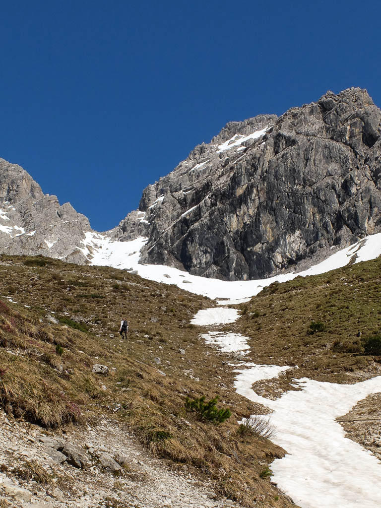 Je höher hinauf es geht, desto mehr Schnee liegt auf dem Wanderweg. Streckenweise müssen wir ihn sogar verlassen und weglos weitergehen:
