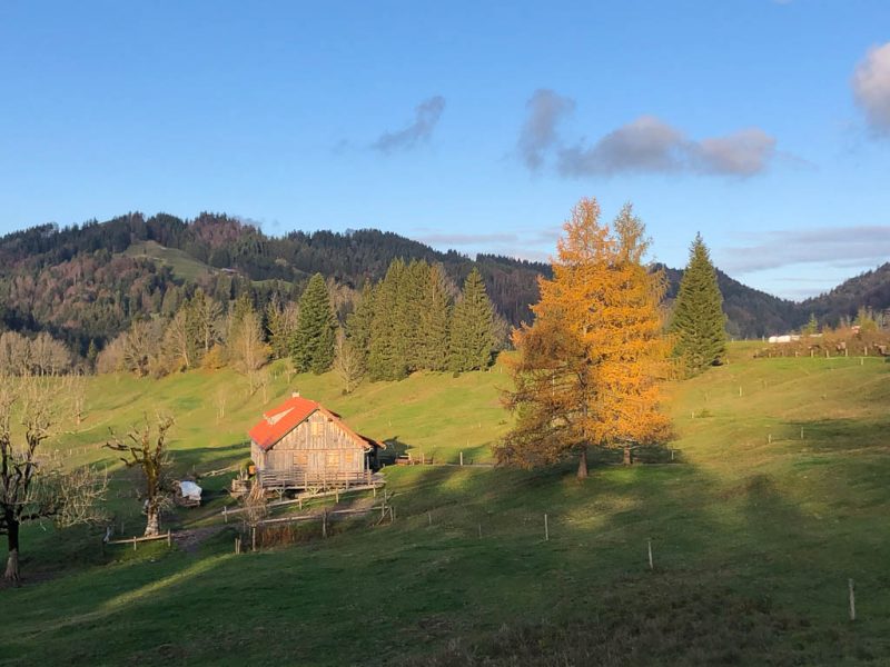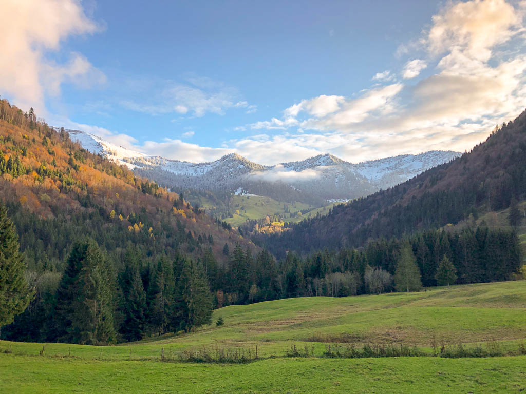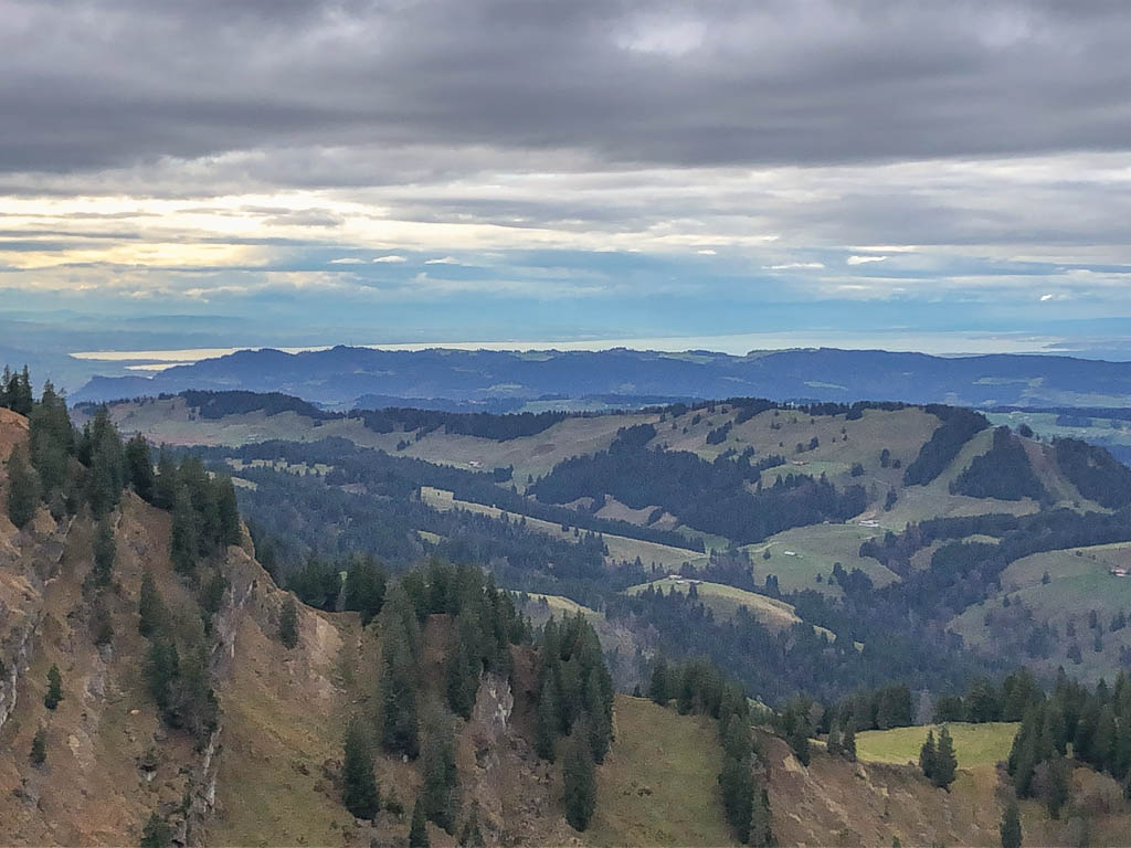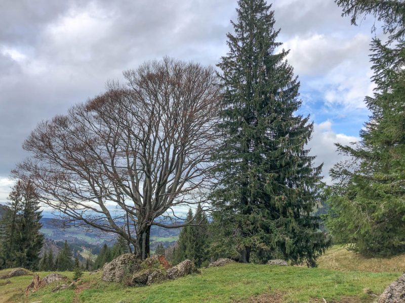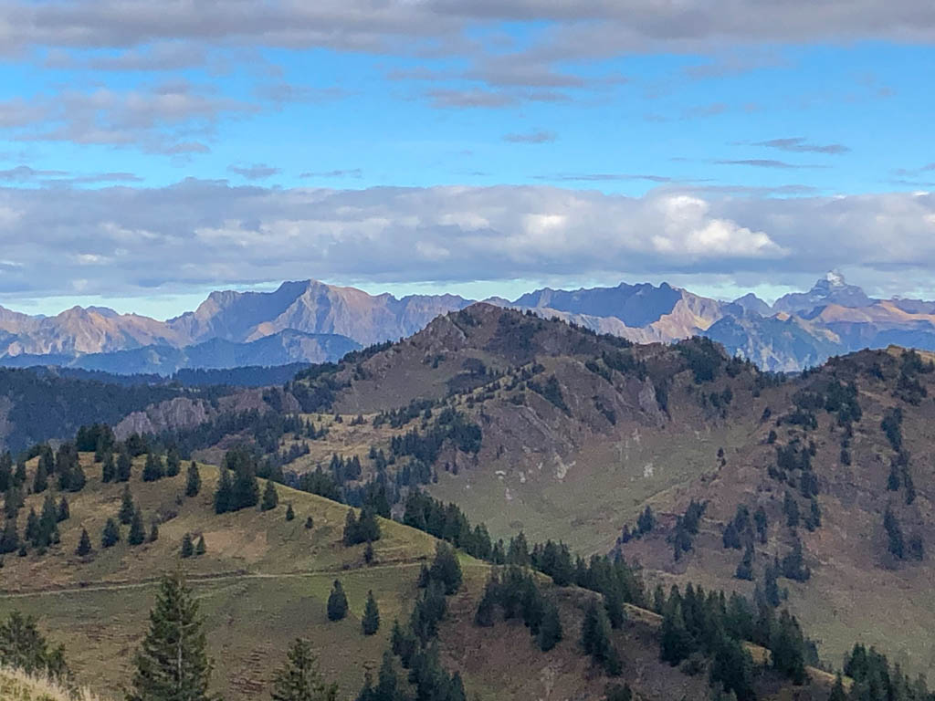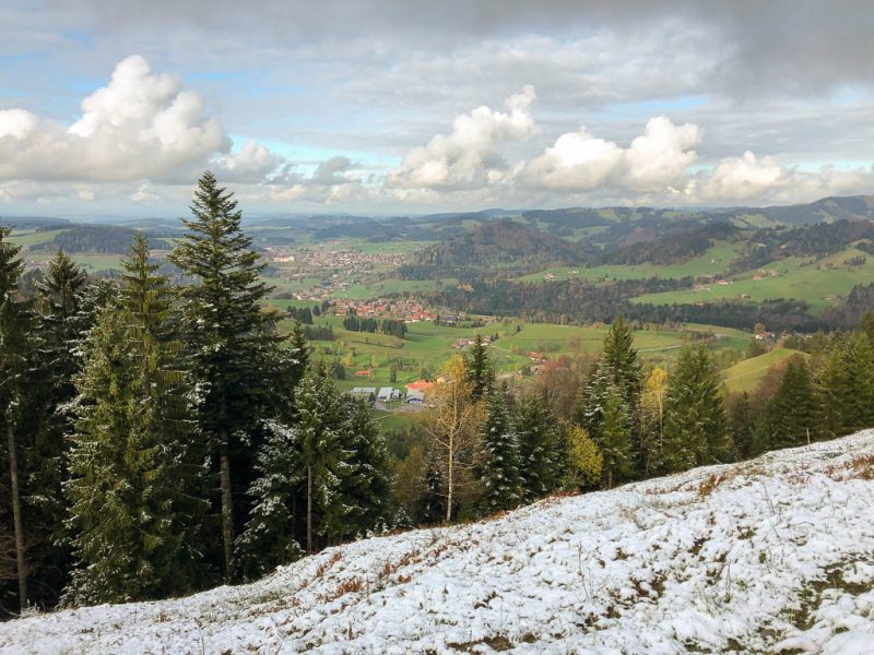 Leider kennt unser Vorgänger aber den Weg ebenso wenig wie wir, so dass wir uns mehr als einmal unter tiefhängenden Ästen bücken oder zwischen den dicht stehenden Bäumen durchquetschen müssen. Aber schließlich ist es geschafft, wir können einem „normalen“, nach Brienz führenden Wanderweg folgen. Von Brienz aus ist es dann noch knapp eine Stunde zurück nach Lenz. Der Blick zurück auf Brienz:
