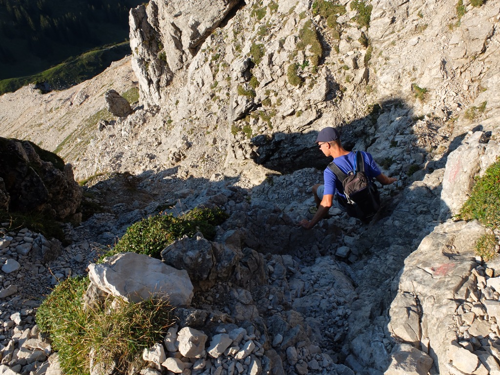 Ging man die ganze Tour bis zum Großen Daumen, musste man außerdem berücksichtigen, dass der Rückweg durchs Koblat auch nicht ganz ohne war. Hier konnte man sich zwar nicht zu Tode stürzen, aber es empfahl sich trotzdem, konzentriert und aufmerksam unterwegs zu sein. Sonst bekam man von einem der vielen auf dem Weg herumliegenden Steine unversehens ein Bein gestellt. Als wir um 19.15 Uhr den Rückweg antraten, war die Sonne schon hinter dem Grat des Hindelanger Klettersteigs verschwunden und der Koblat lag vollständig im Schatten: