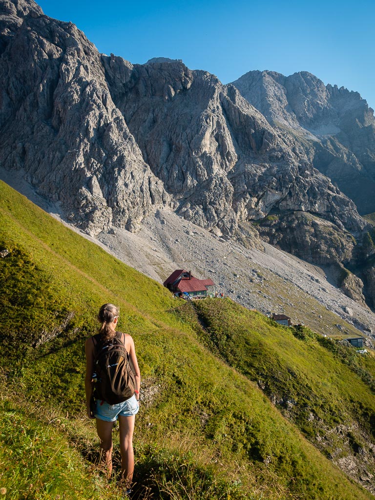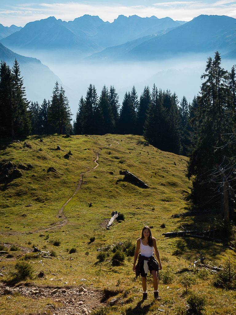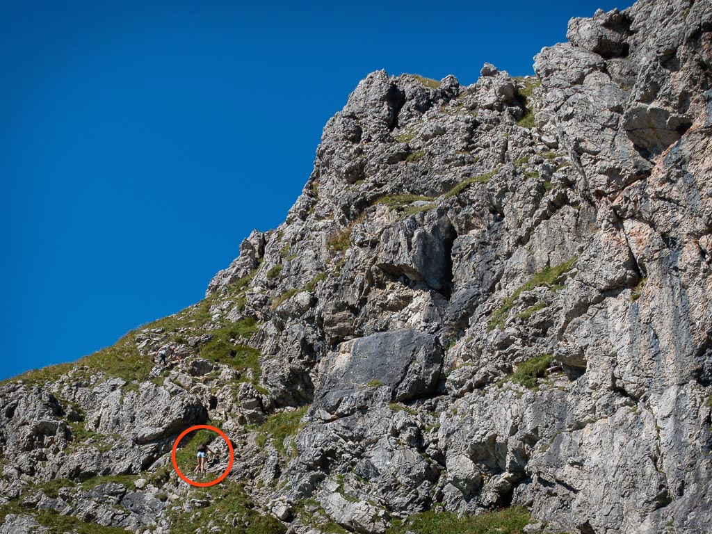 Die Wände des 2595 Meter hohe Gipfels waren ohne Ausnahme steil und glatt und nur mit Kletterei der Schwierigkeitsstufe III – IV zu erreichen. Wir mussten uns also mit einem Blick aufs Gipfelkreuz begnügen. Der Weg zum Waltenberger-Haus, der unterhalb des Gipfels vorbeiführte, war für mich sowieso anspruchsvoll genug. Erst ging es aber entspannt durch die Märchenwiese: