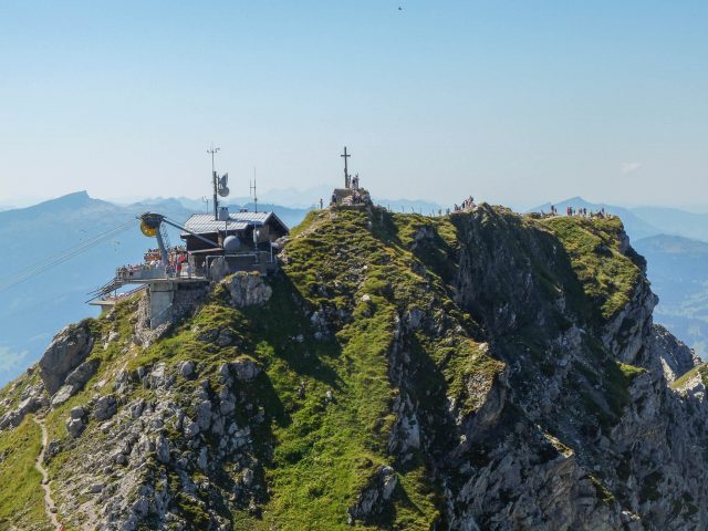 Dass wir fast allein unterwegs waren, lag vor allem daran, dass wir wie immer erst gegen Mittag aufbrachen. Wem nach dem Begehen des Klettersteigs und der Rückkehr zur Station „Höfatsblick“ der Nebelhornbahn der Abstieg nach Oberstdorf zu viel wurde, der muss nämlich zeitiger los. Die letzte Bahn Richtung Tal fuhr um etwa 17 Uhr. Um diese Uhrzeit waren wir noch mitten im Klettersteig. Anfangs mussten wir uns allerdings schon ins Menschengetümmel stürzen: An der Talstation der Nebelhornbahn war heute um einiges mehr los als gestern. Aber an der Gipfelstation angekommen, waren nur ein paar Schritte in Richtung Klettersteig notwendig und schon herrschte Ruhe ums uns herum. Ein Blick zurück zum Gipfel zeigte uns, welches Gewimmel wir gerade hinter uns gelassen hatten: