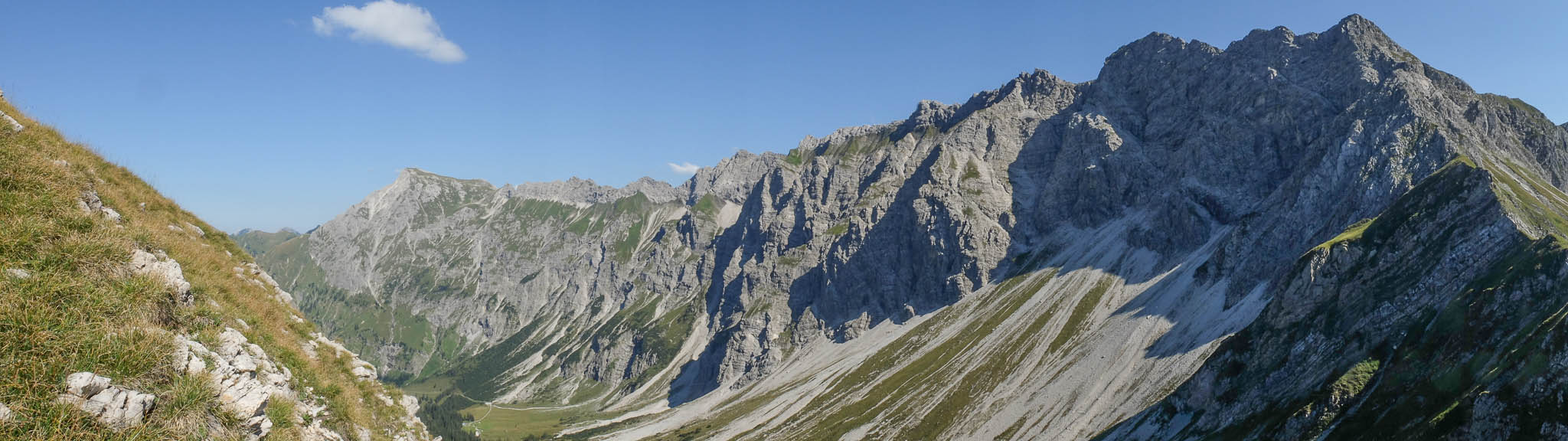 Die Belohnung für die Mühe: Richtung Süden ein herrlicher Blick aufs Nebelhorn und den anschließenden Hindelanger Klettersteig, Richtung Norden eine nicht weniger beeindruckende Aussicht auf die Rotspitze und hinunter ins Rettenschwangertal: