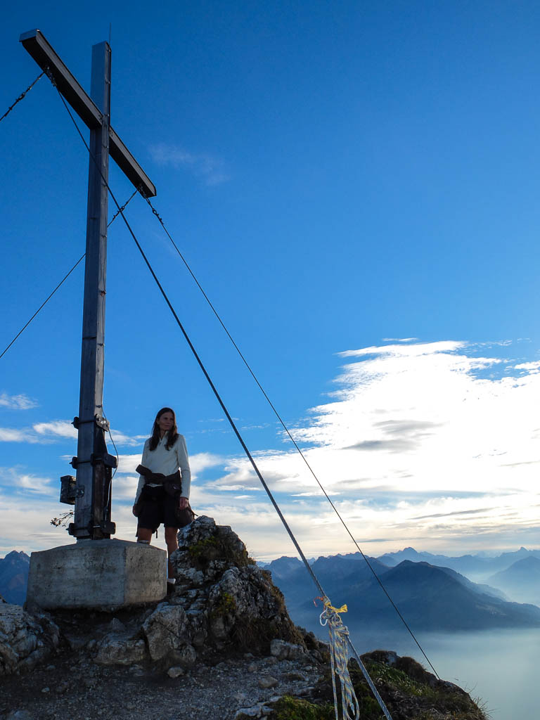 Mit dem Verschwinden der Sonne wurde es plötzlich so kalt, dass ich nicht nur Pullover, Jacke und lange Hose, sondern auch Handschuhe und Stirnband anzog. Während wir am An- bzw. Umziehen waren, tauchte über dem Gipfel plötzlich ein Drachenflieger auf und rief uns mit einem Lachen „Da glaubt man sich mal unbeobachtet!“ zu, drehte ab und verschwand in Richtung Tal: