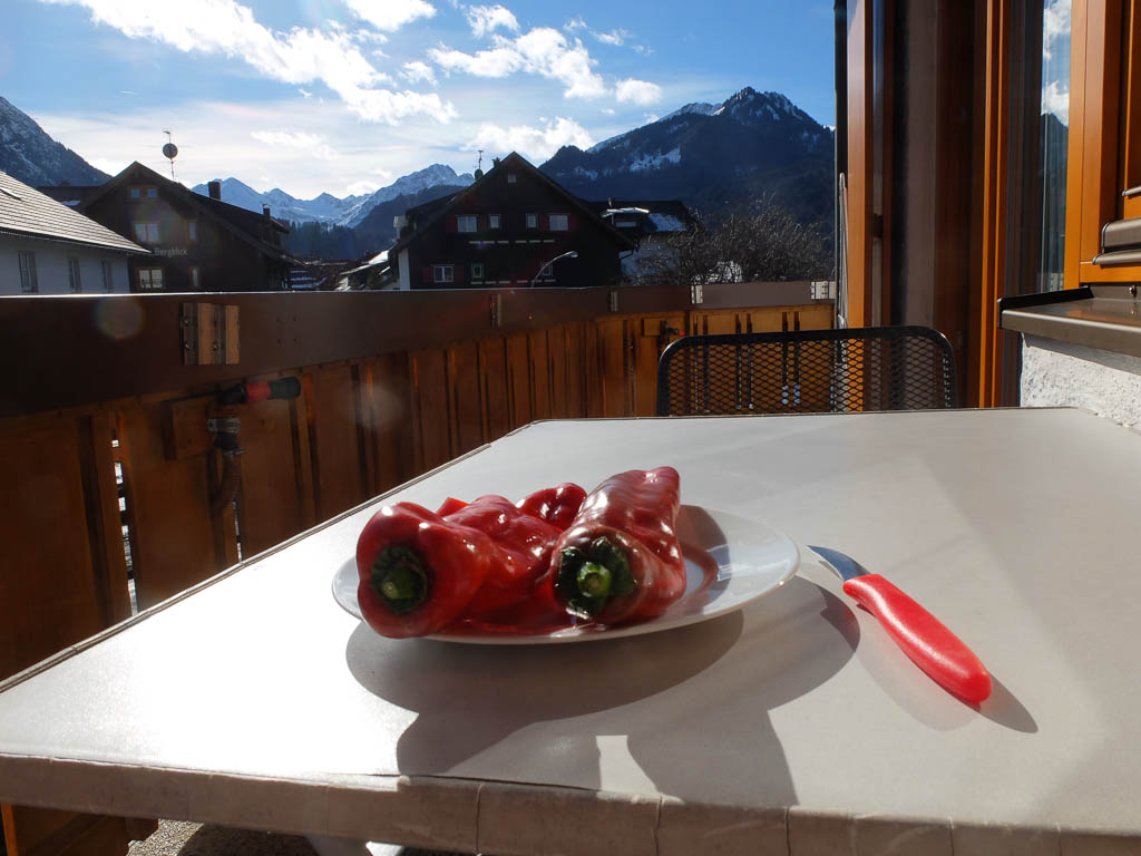 Die Erinnerungen an die Vergangenheit, die gestern beim Schreiben meiner Geschichte aufkamen, ließen mich bis weit nach Mitternacht nicht zur Ruhe kommen. Damals hatte ich zusammen mit meinen Kindern mühelos ein neues Zuhause gefunden, warum gelang mir das jetzt zusammen mit Guido nicht? Gegen drei Uhr in der Frühe schlief ich endlich ein. Einige zaghafte Sonnenstrahlen, die nach dem gestrigen Regentag den Weg nach Oberstdorf fanden, lockten mich um 9.00 Uhr aus dem Bett. Zwei Stunden später gab es die erste Mahlzeit. Sie bestand aus einer Tomate „Marina“ von 140 Gramm und 110 Gramm Zuckerhut. Sowohl der Obst- und Gemüsehändler als auch Guido waren ganz begeistert von dem Aroma dieser Tomatensorte, meinen Bedarf traf sie allerdings nicht. Der lag eindeutig beim roten Paprika: