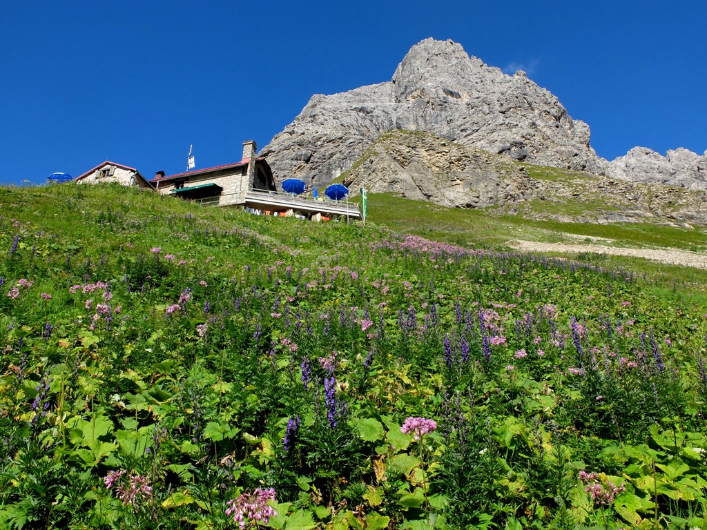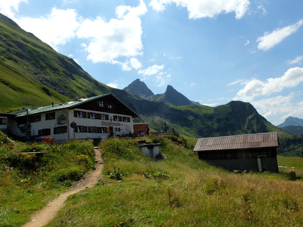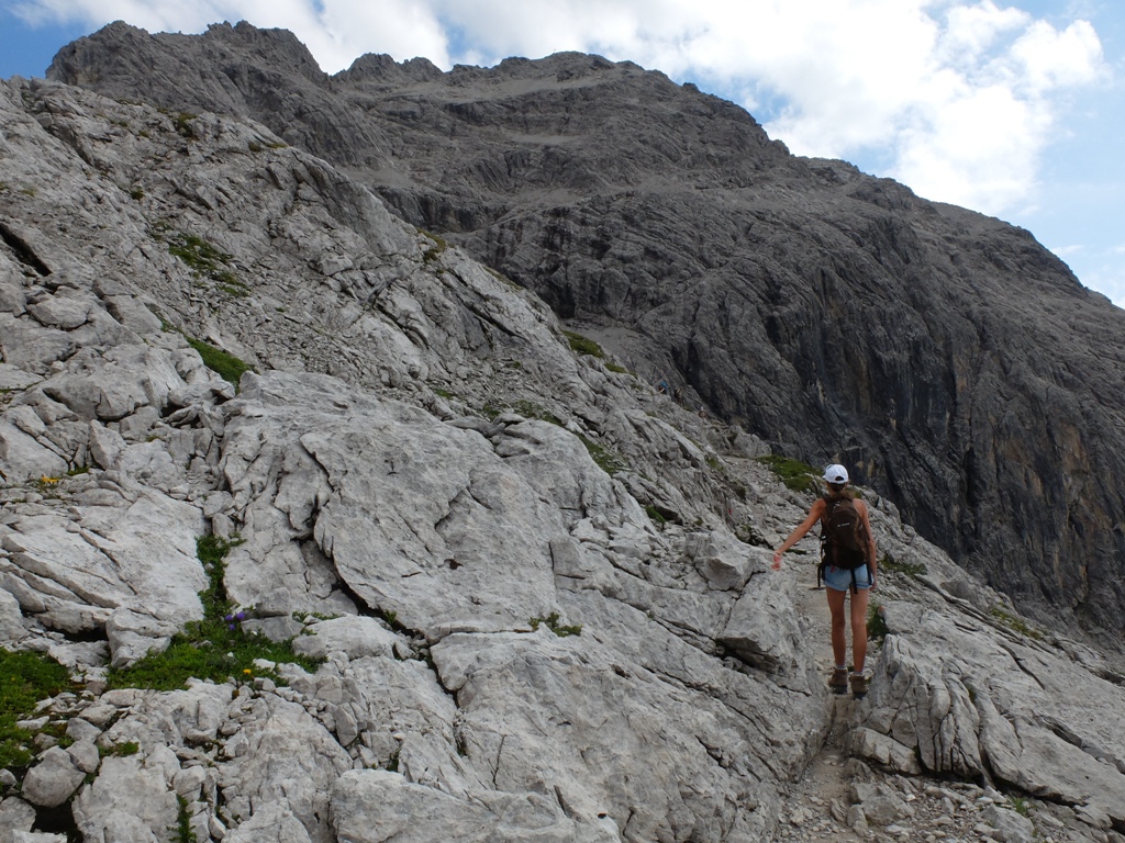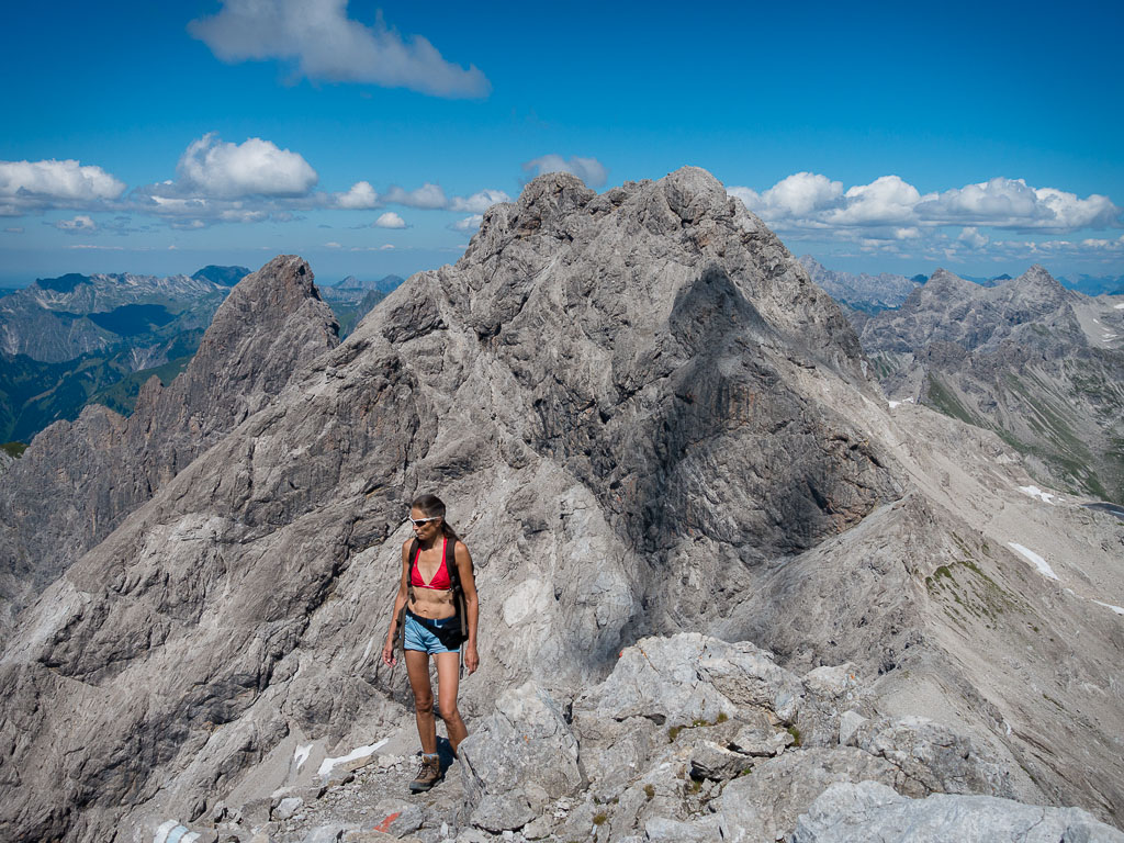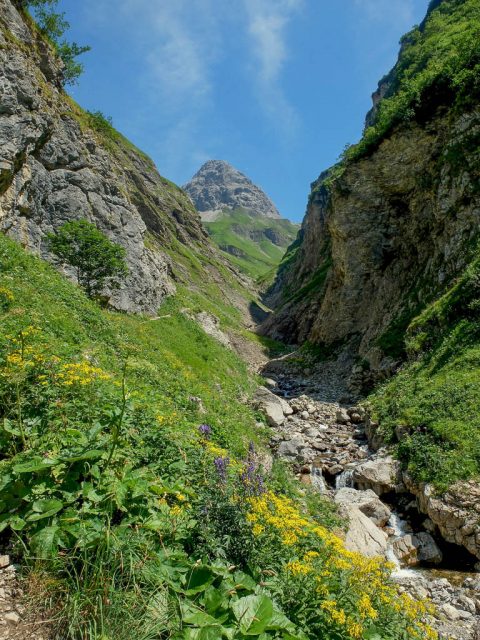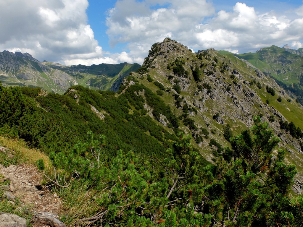 Seit Wochen hatte ich schon die verschiedensten Tourenberichte rund um diesen Berg studiert und mein Wunsch war es, wenigstens das Gebiet im unteren Bereich des Ostgipfels zu erforschen. Heute war es endlich so weit. Wir wollten mit den Fahrrädern bis zur Käser-Alpe fahren und von dort über einen Grat – so weit es unsere Nerven zuließen – zum Ostgipfel aufsteigen. Mein persönliches Ziel: So weit aufsteigen, bis das erste Edelweiß am Wegesrand blühte.