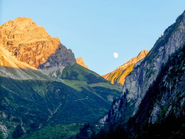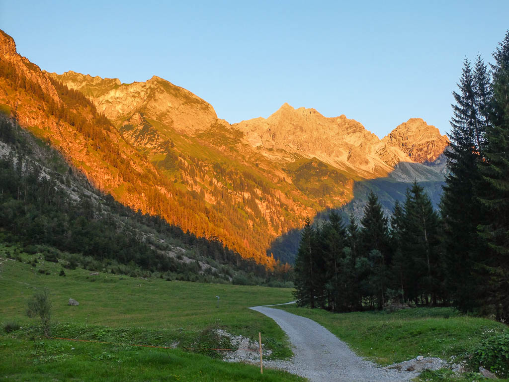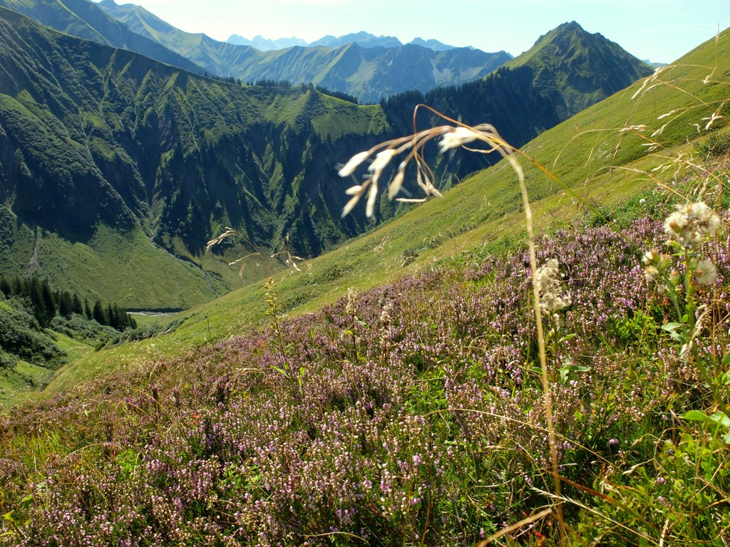 Um 19.20 Uhr konnten wir an der Käser-Alpe wohlbehalten unsere Fahrräder in Empfang nehmen. Trotz des – für mich – steilen Geländes, konnte ich die Strecke hinunter ins Tal im Sattel sitzend zurücklegen. Es gab einen längeren Zwischenstopp, um Samenstände des Breitwegerichs zu essen und zu beobachten, wie die untergehende Sonne, die Berge zum Glühen brachte: