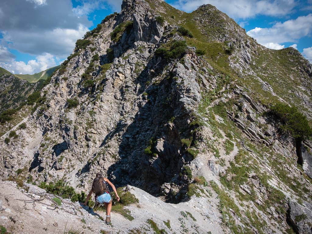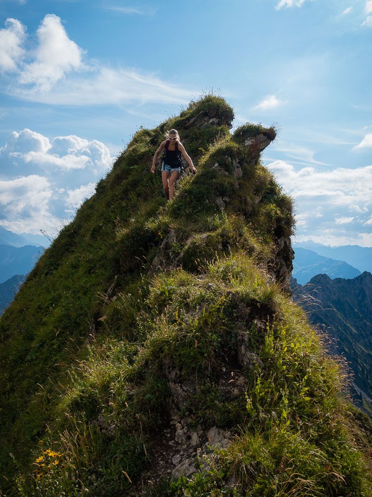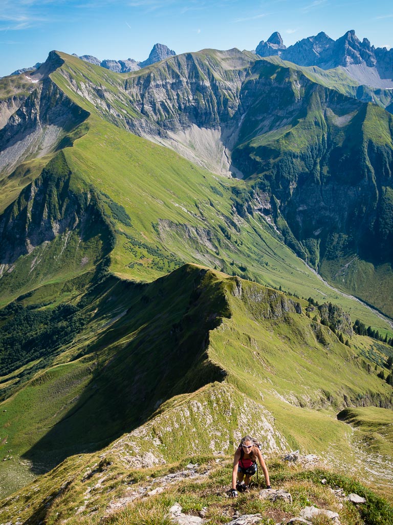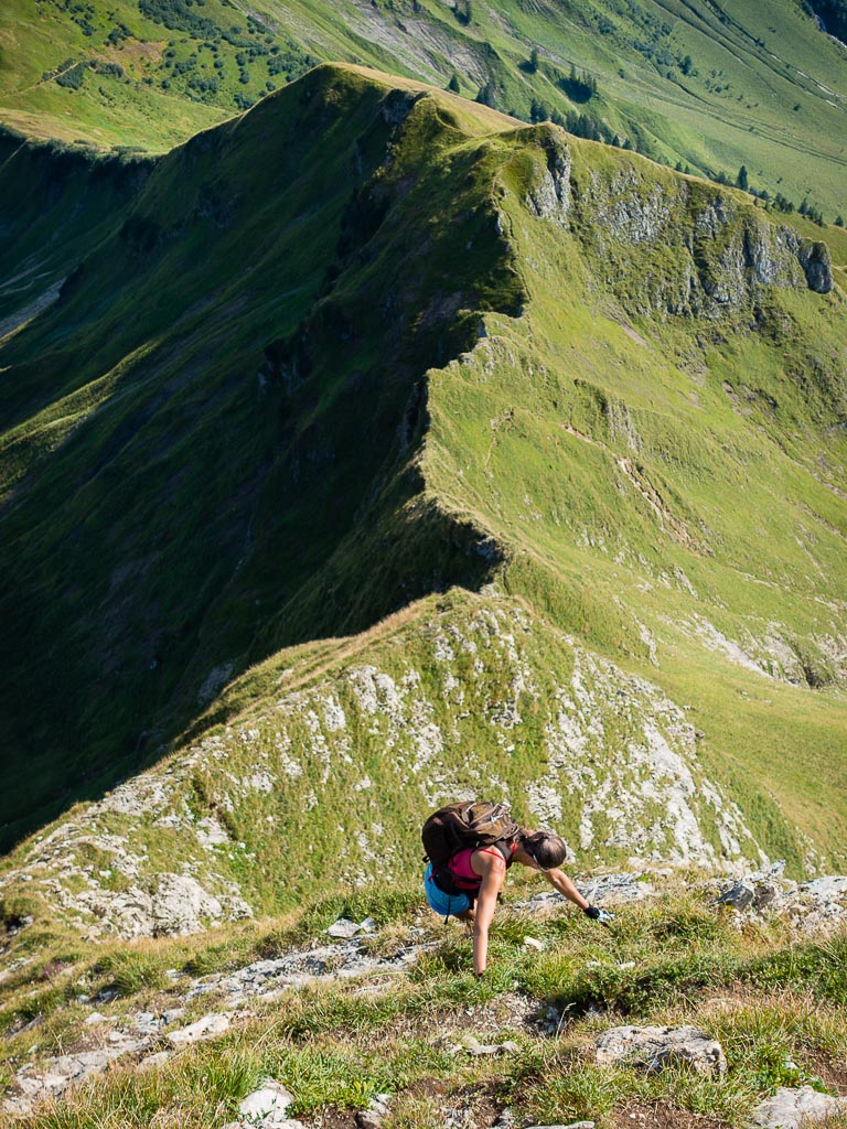 Damit war mein heutiges persönliches Ziel eigentlich schon erreicht und ich hätte mich gemütlich ins Gras setzen und die herrliche Landschaft um mich herum genießen können. Aber noch war der Weg entlang des Grats gut zu gehen, so dass keiner von uns beiden an Rast oder Umkehr dachte. Und so ging es munter weiter hinauf, immer steiler und steiler, bis ein Gehen nicht mehr möglich war, sondern geklettert werden musste. Impressionen dieses Streckenabschnitts: