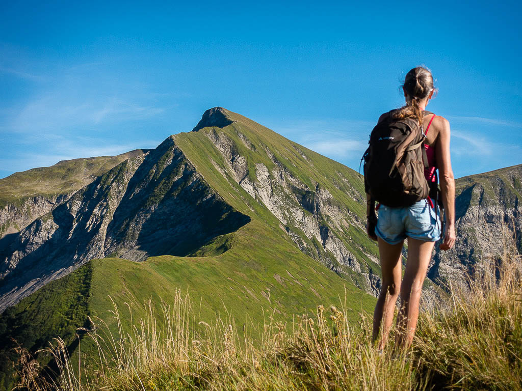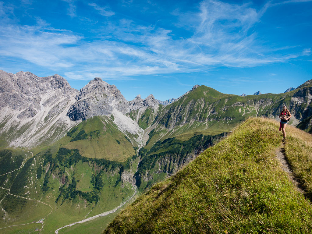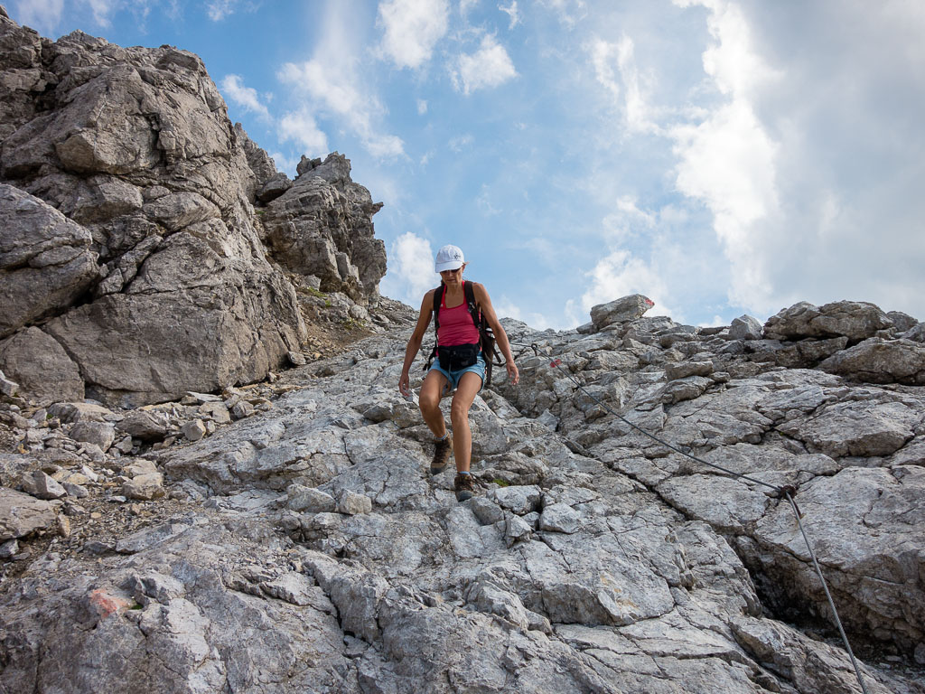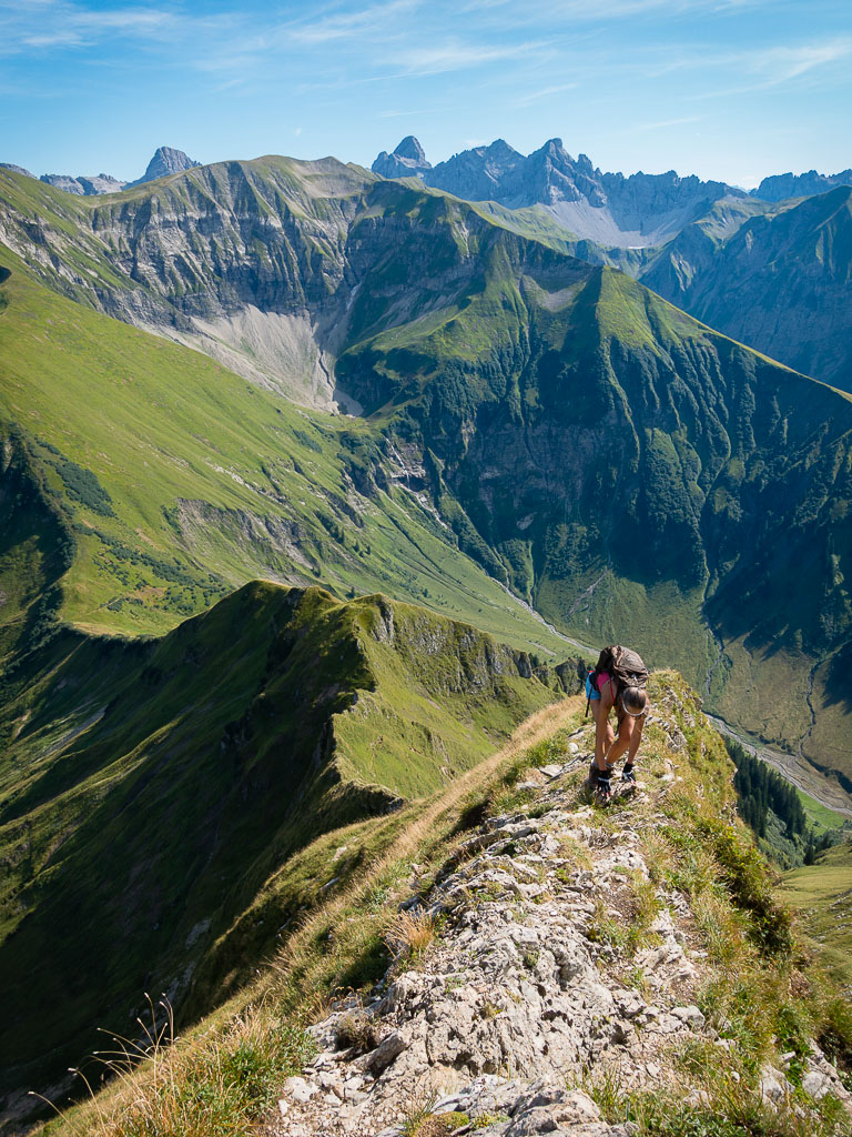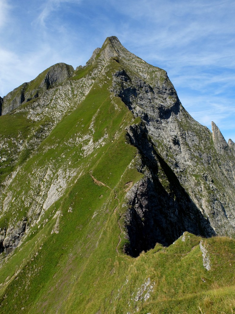 Damit war mein heutiges persönliches Ziel eigentlich schon erreicht und ich hätte mich gemütlich ins Gras setzen und die herrliche Landschaft um mich herum genießen können. Aber noch war der Weg entlang des Grats gut zu gehen, so dass keiner von uns beiden an Rast oder Umkehr dachte. Und so ging es munter weiter hinauf, immer steiler und steiler, bis ein Gehen nicht mehr möglich war, sondern geklettert werden musste. Impressionen dieses Streckenabschnitts: