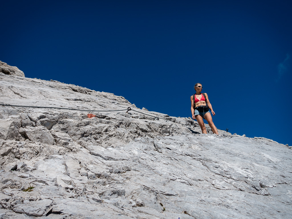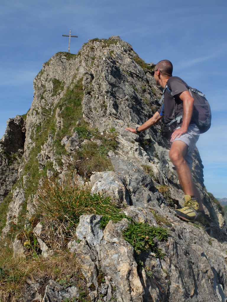 Mir war beim Zuschauen bei Guidos Kletterei sofort klar, dass hier für mich Schluss war. Und nach kurzer Rücksprache entschied dann auch Guido, die Schlüsselstelle – zumindest heute – nicht zu passieren. Aber wir werden zurückkehren, das nächste Mal vielleicht mit einem kurzen Seil. Weiter unten am Fels war nämlich ein Standplatz mit Haken, von dem aus an dieser kritischen Stelle gesichert werden konnte, so dass man sich im Falle eines Falles nicht unversehens im Tal wiederfand. Ein letzter Blick zum Gipfel: