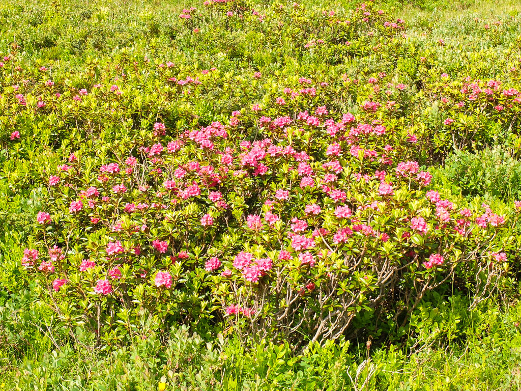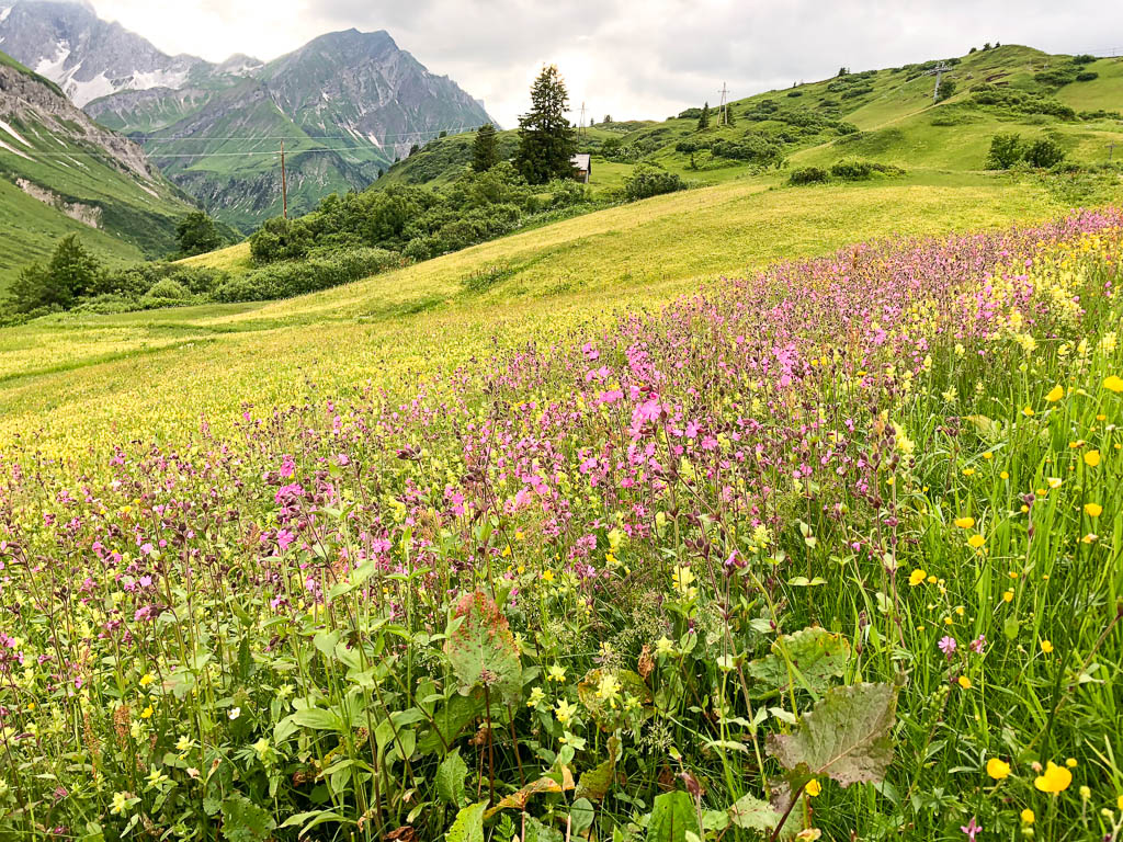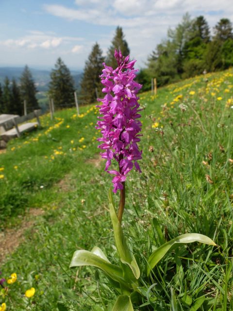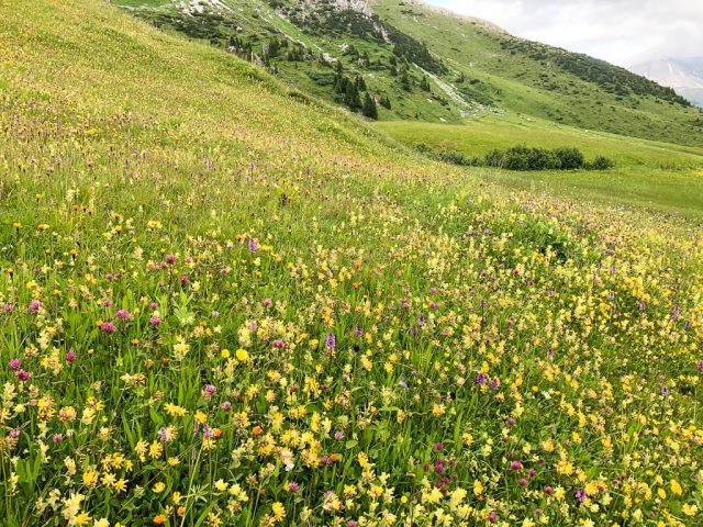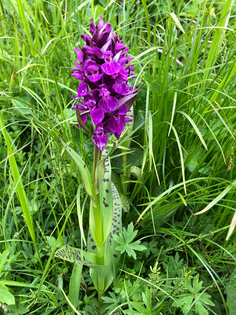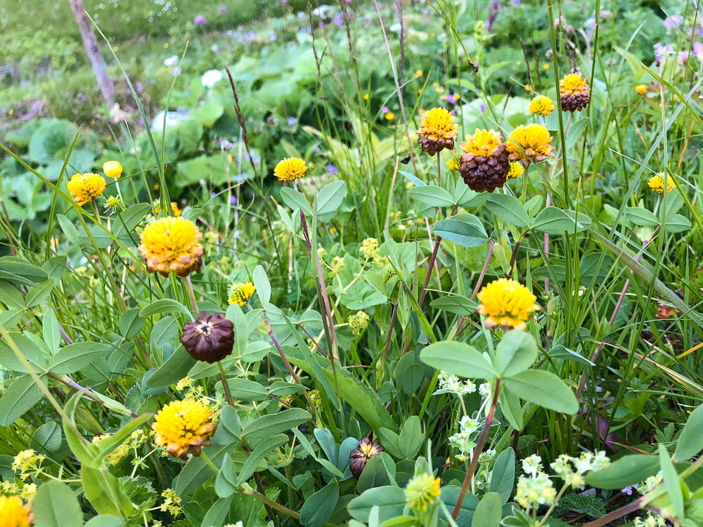 Zurück zum Parkplatz geht es durch üppige Vegetation und das Auge weiß manchmal nicht, wo es hingucken soll vor lauter Blumenpracht. Wiese mit Knabenkräutern, Wundklee, Klappertopf, Storchenschnabel und Rotem Klee: