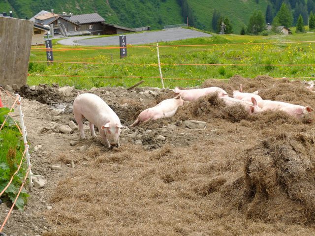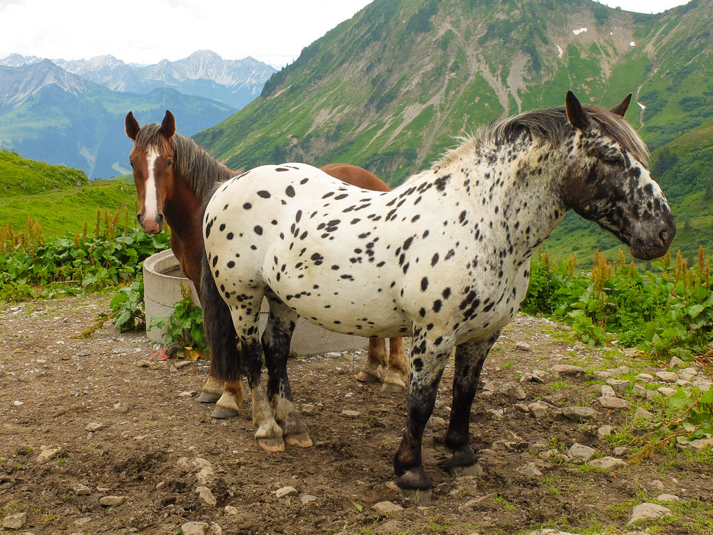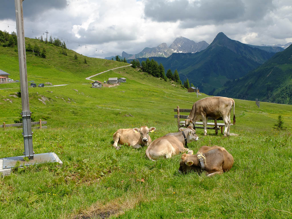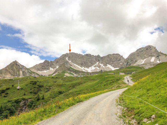 Als Ausgangspunkt wählen wir schließlich den Hochtannbergpass, da von hier aus der Aufstieg kürzer ist und unsere Tour erst am frühen Nachmittag startet. Am Parkplatz des Hochtannbergpasses müssen wir allerdings feststellen, dass aus der geplanten Tour nichts werden kann: Die Aufstiegsrinne liegt noch voller Schnee. Mit Hilfe von Internet und GPS-Gerät finden wir aber recht schnell ein neues Gipfelziel, das Karhorn. Vom Parkplatz aus geht es anfangs mäßig steil über Weidegelände, später über eine Fahrstraße, die in ein Skigebiet führt, hinauf. Hier ist erstmals die Nordseite des Karhorns in seiner ganzen Pracht zu sehen: