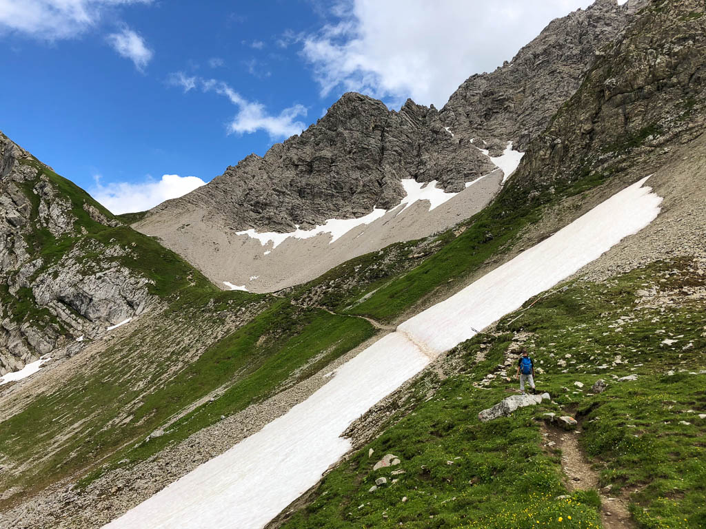 Auf dem Weg zum Sattel zwischen Warther Horn und Karhorn ist ein größeres Schneefeld zu überqueren: