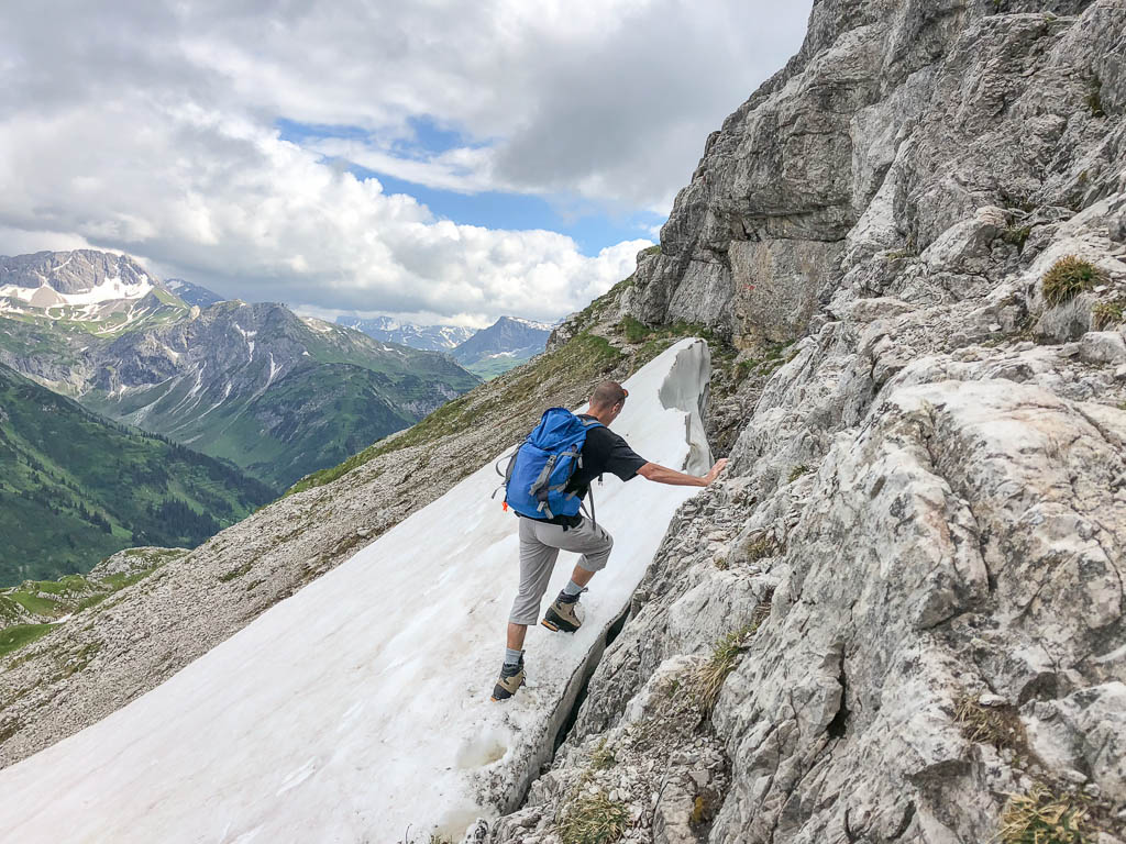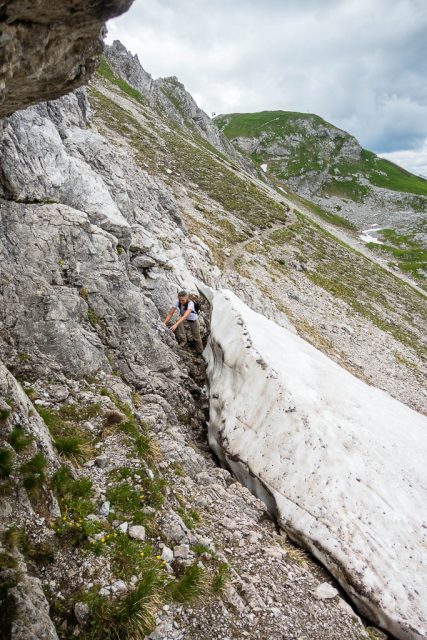 Vom Sattel aus geht es erst einmal wieder ein Stückchen bergab und dann weiter an der Südflanke entlang. Hier liegt ein weiteres Schneefeld auf dem Weg, bei dem Drüberklettern oder Durchkriechen angesagt ist: