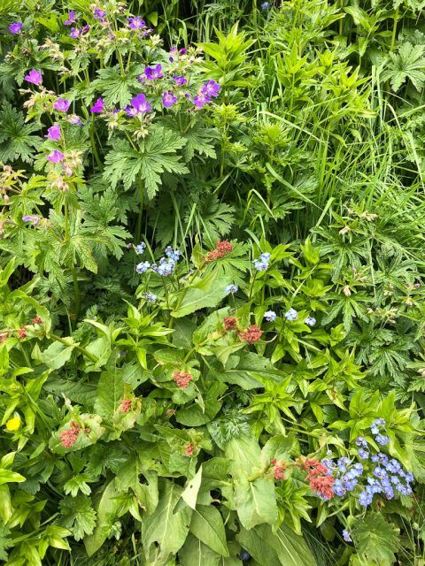 Komposition aus Storchenschnabel, Ampfer und Vergissmeinnicht: