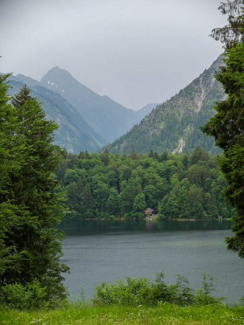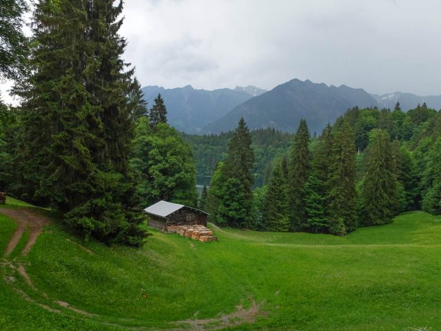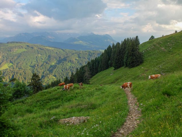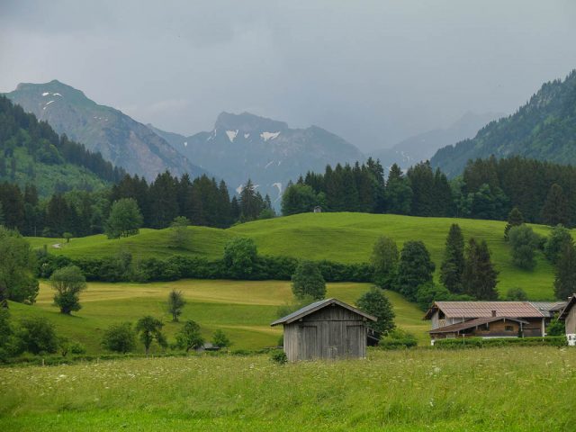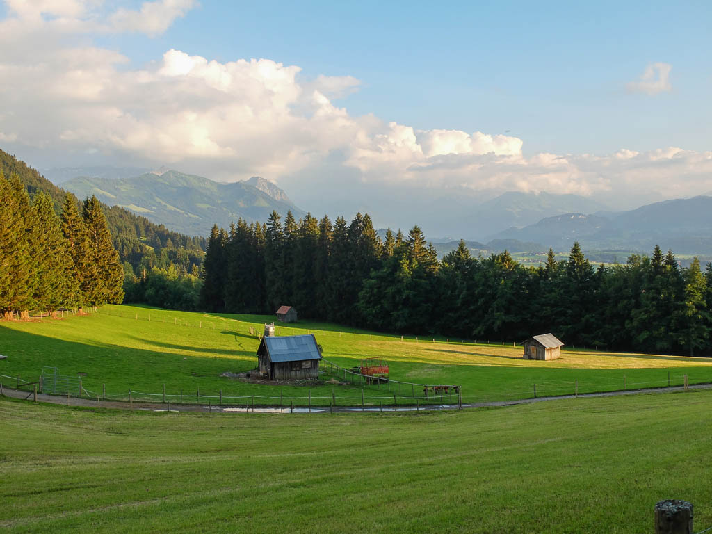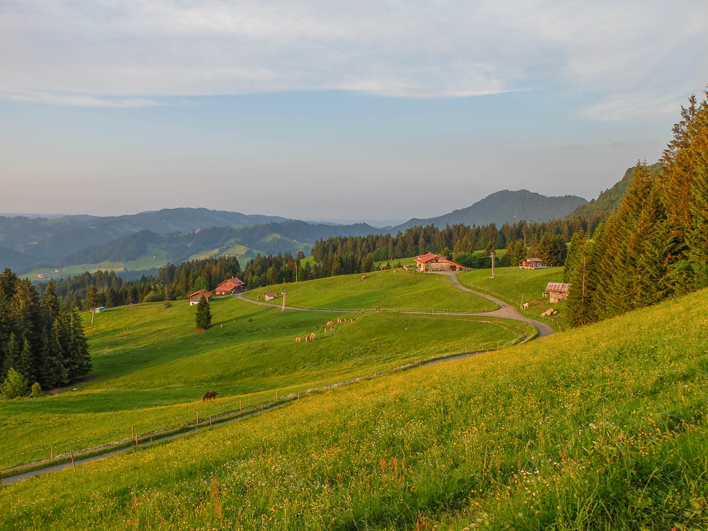 Im Hintergrund sind Rubihorn und Entschenkopf zu erkennen sowie das in Wolken gehüllte Nebelhorn zu erahnen. Am Berggasthof Alpenblick, kurz vor Ende unserer Wanderung: