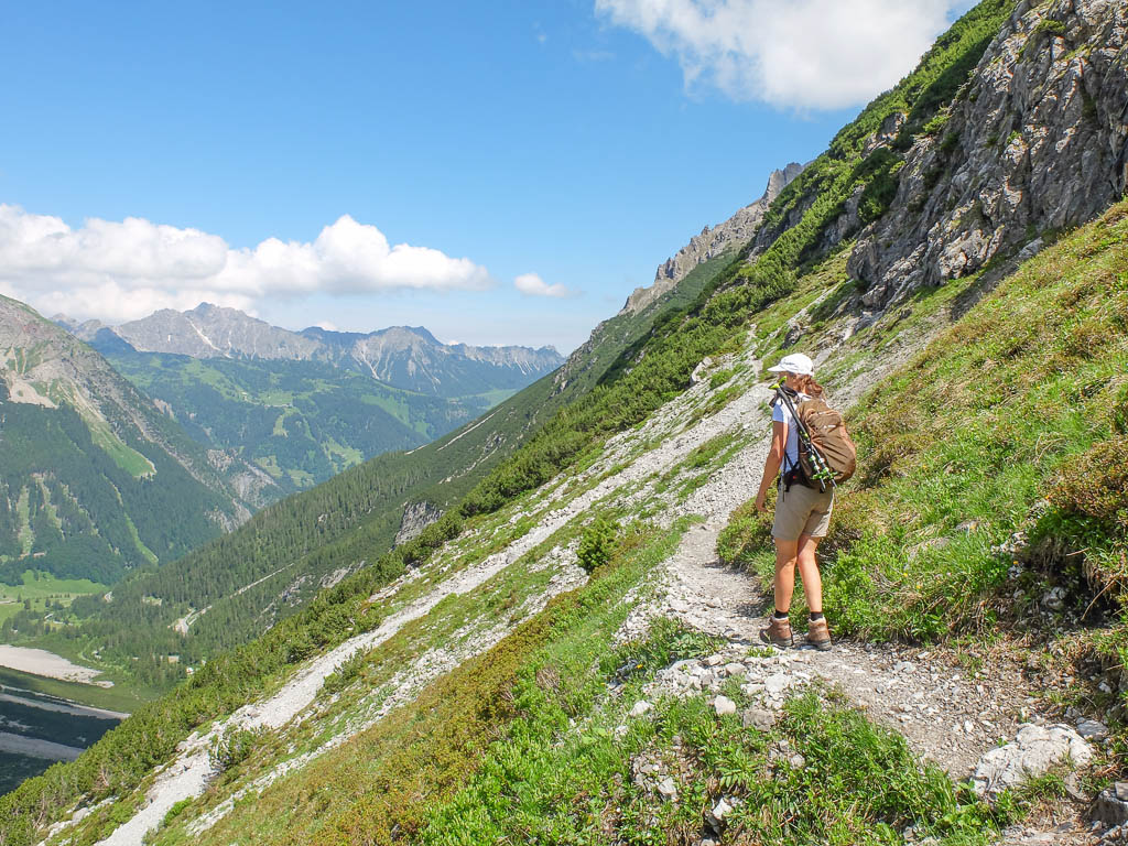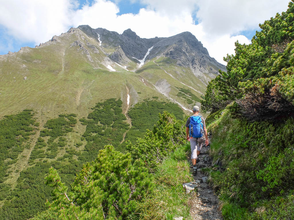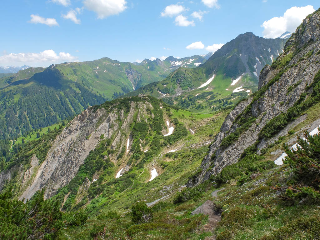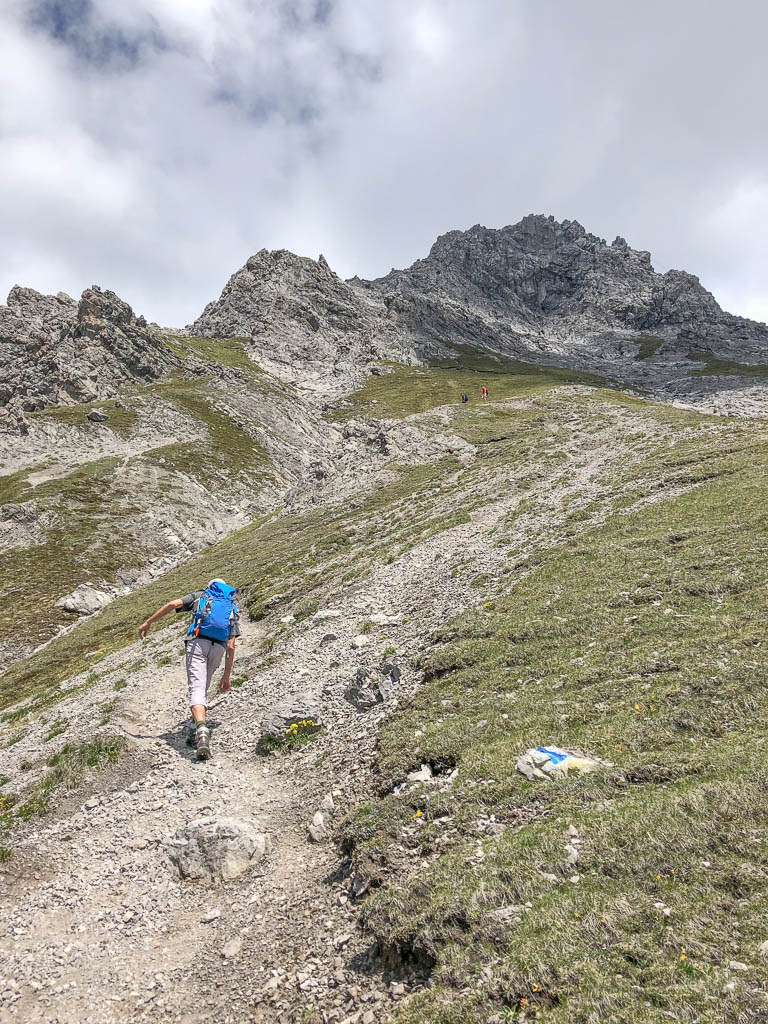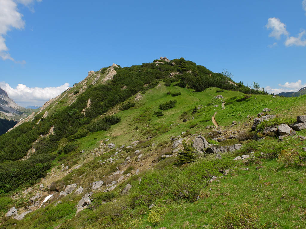 Eigentlich wollen wir das Hörnle überschreiten, aber als wir sehen, wie der Weg auf der anderen Seite hinuntergeht bzw. wieder hinaufgeht, wird uns doch etwas mulmig zumute: