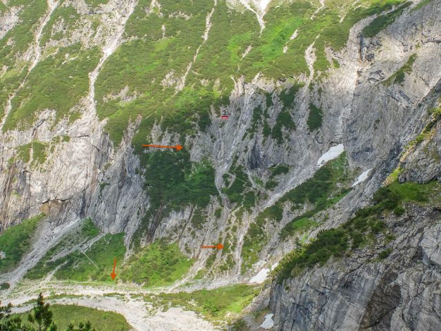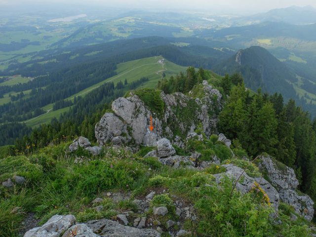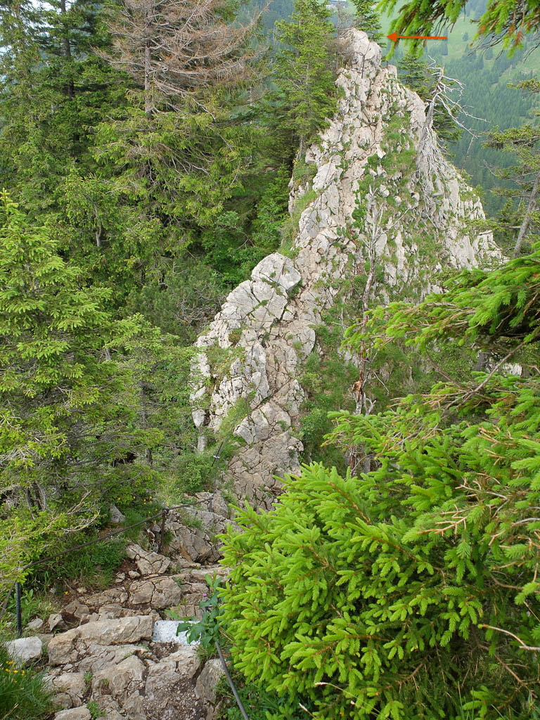 Der Fels ist zwar bis zum höchsten Punkt (Pfeil) mit Drahtseilen gesichert, aber wer weiß, wie es auf der anderen Seite aussieht?! Daher beschließen wir, über den Aufstiegsweg zurückzukehren. Später erfahren wir, dass die Stelle nur halb so schlimm ist, wie sie aussieht und dass es auf diesem Weg anschließend deutlich bequemer weitergeht als auf dem Weg, den wir wählen. Für das nächste Mal wissen wir Bescheid! An der Abzweigung wandern wir auf dem Hauptweg durch Wald Richtung Grüntenhaus weiter. Der Wald lichtet sich und der über dem Grüntenhaus thronende Sendeturm wird sichtbar: