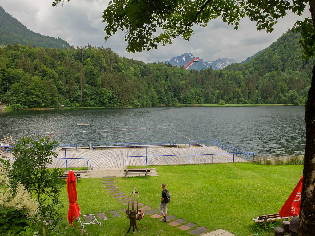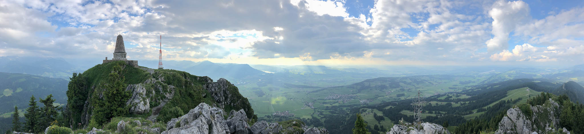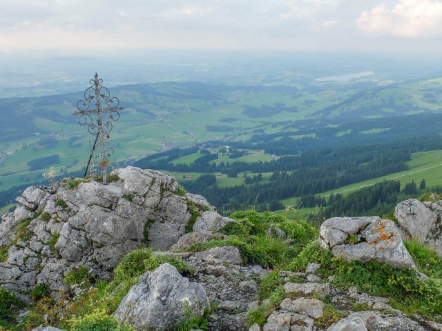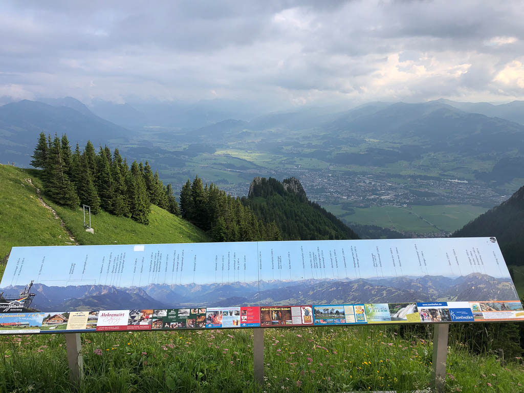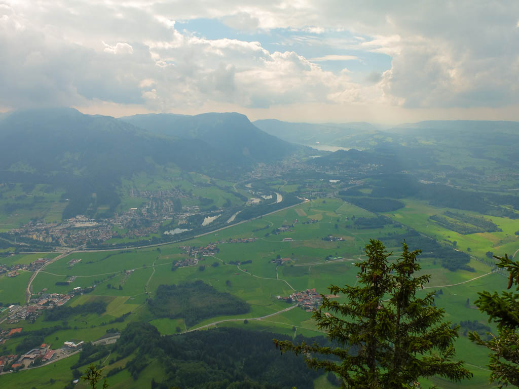 Auch wenn die Gipfel der meisten Berge heute in Wolken gehüllt sind, das Panorama ist trotzdem beeindruckend. Der Blick auf Blaichach, Immenstadt und den Alpsee: