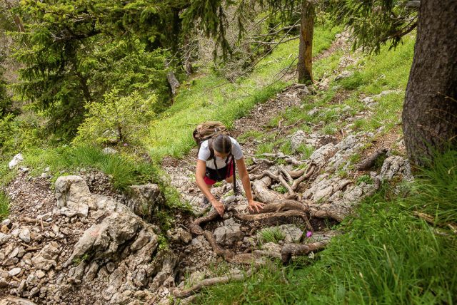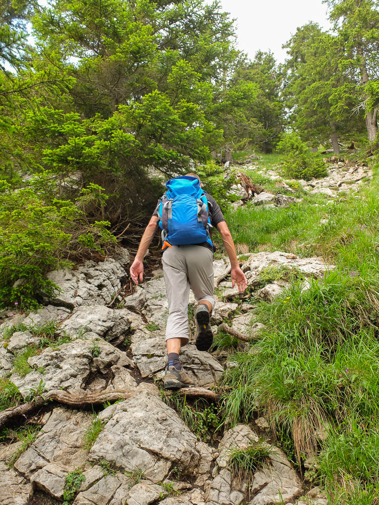 Solche Aufstiege liebe ich! Aber nicht nur, weil ich die Hände zu Hilfe nehmen „muss“: Die Flora wuchert hier überaus üppig und immer wieder liegt Totholz in verschiedenen Zersetzungsgraden im Gelände. Hier herrscht eine wunderschöne, sehr gesunde Unordnung! Über die felsdurchsetzte Grasflanke kurz unterhalb des Gipfels:
