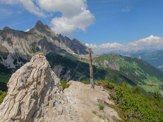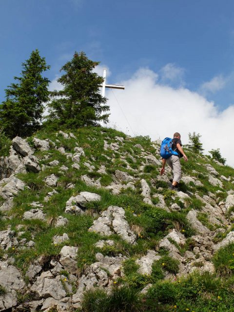Vom Jägerdenkmal aus gehen wir ein paar Schritte über felsiges Gelände weiter, dann stehen wir vor dem Gipfelkreuz des Übelhorns: