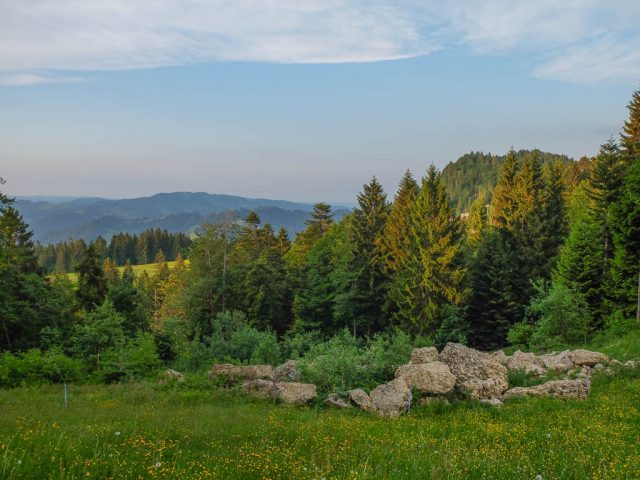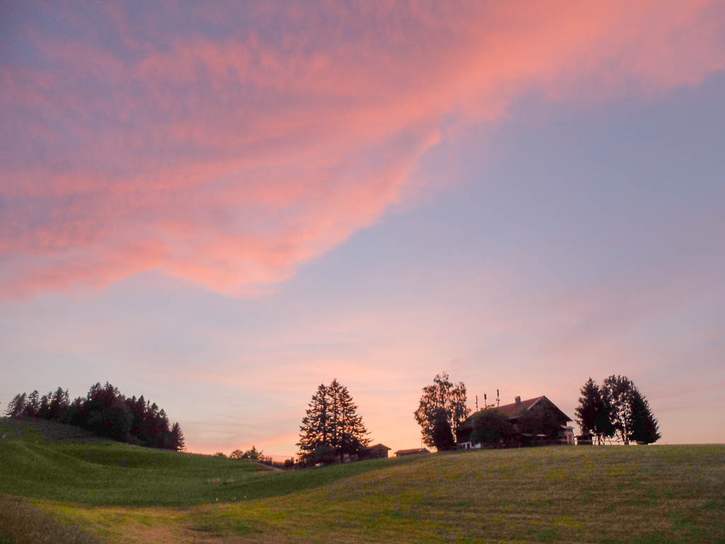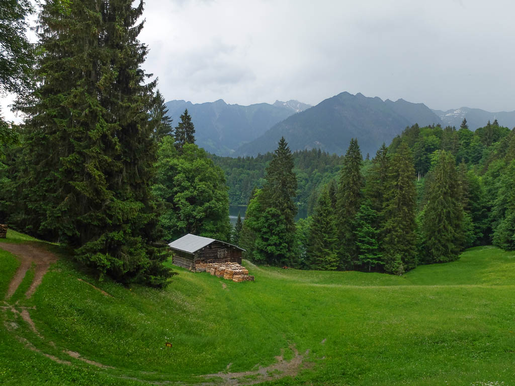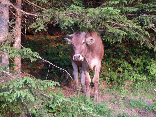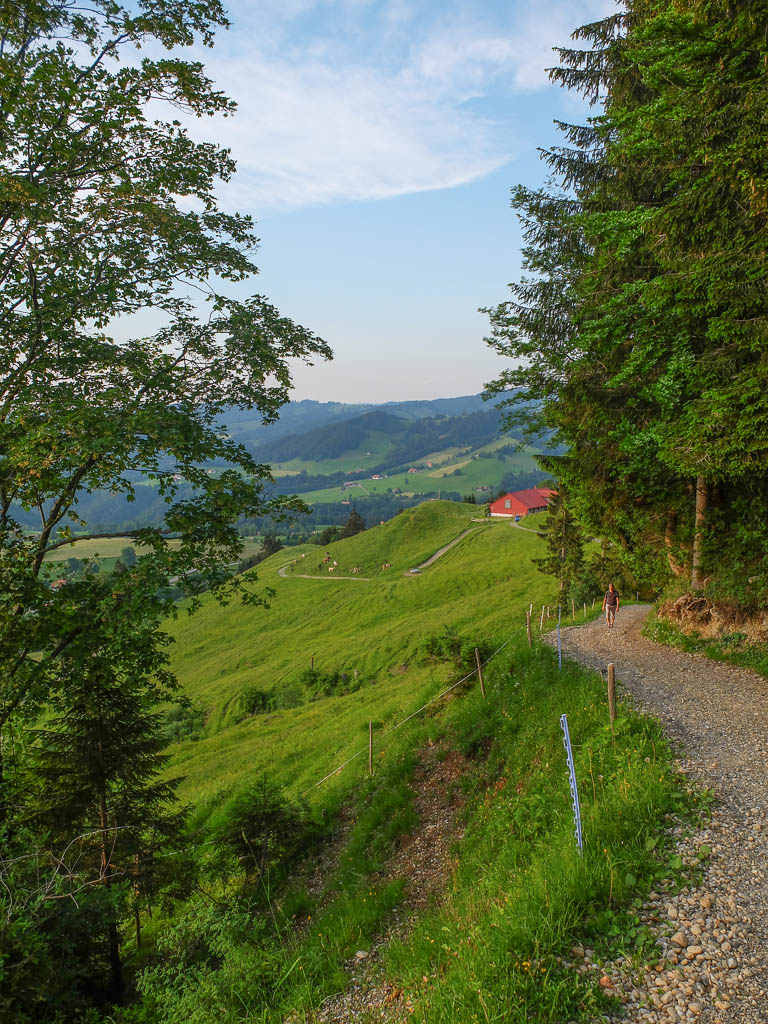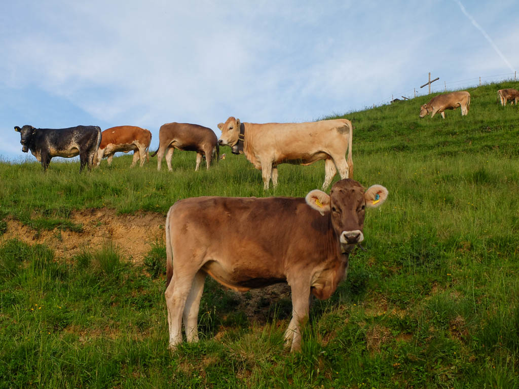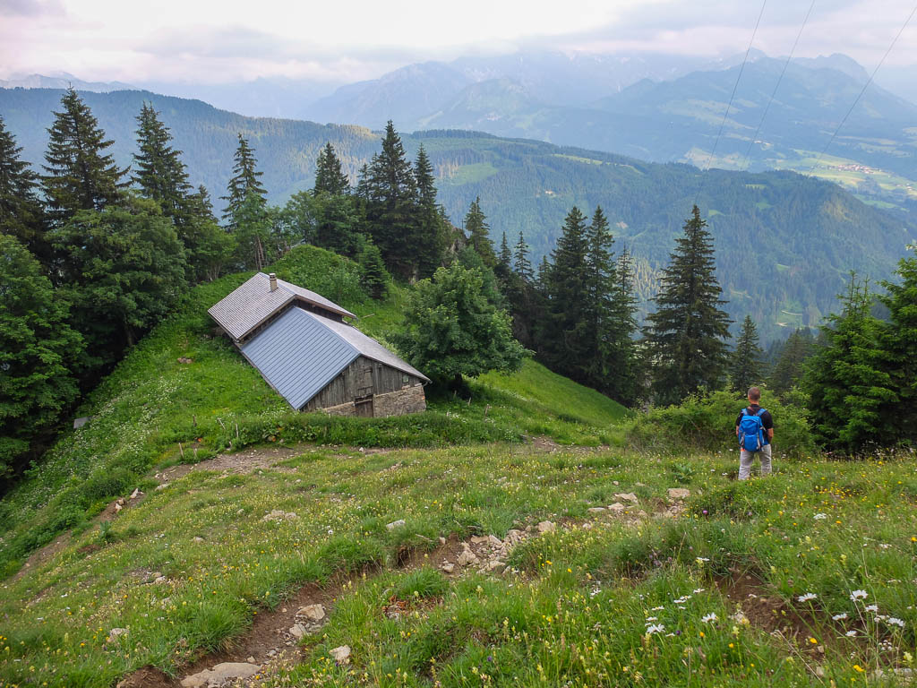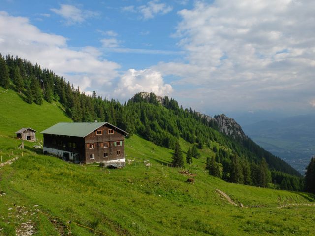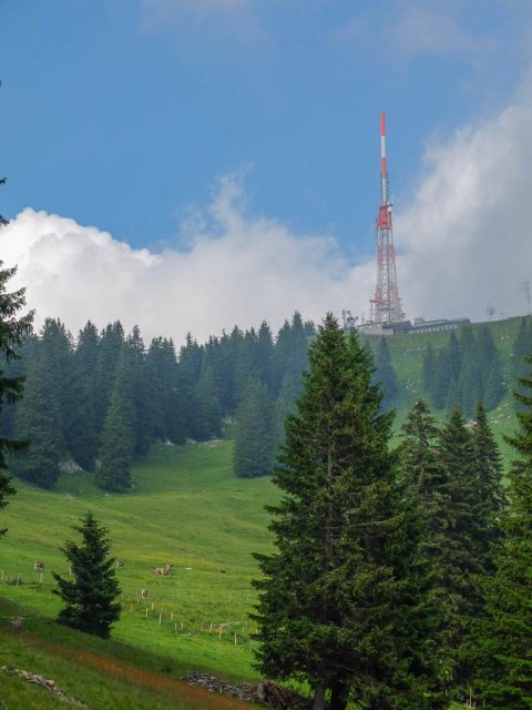 Am Grüntenhaus halten wir einen netten Schwatz mit dem Alphirten. Er zeigt uns, wo in den späten Abendstunden Rotwild am Waldesrand erscheint und meint, wenn wir später auf unserem Rückweg vorbeikommen, können wir das Rudel vielleicht sehen. Aber wir brauchen gar nicht auf später zu warten, denn das Rudel zeigt sich jetzt schon! Kurz darauf geht es weiter Richtung Sendeturm. Der Blick zurück aufs Grüntenhaus: