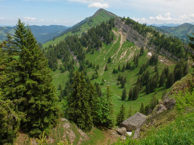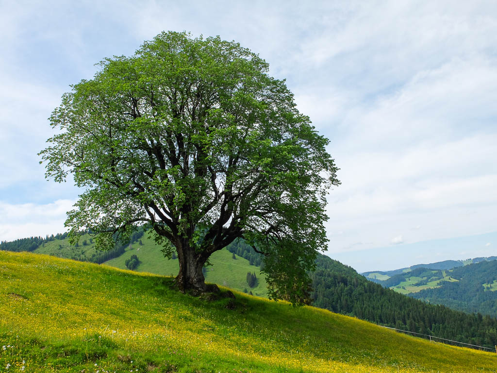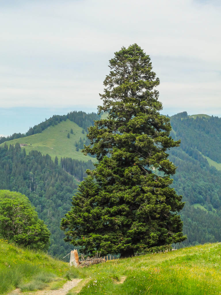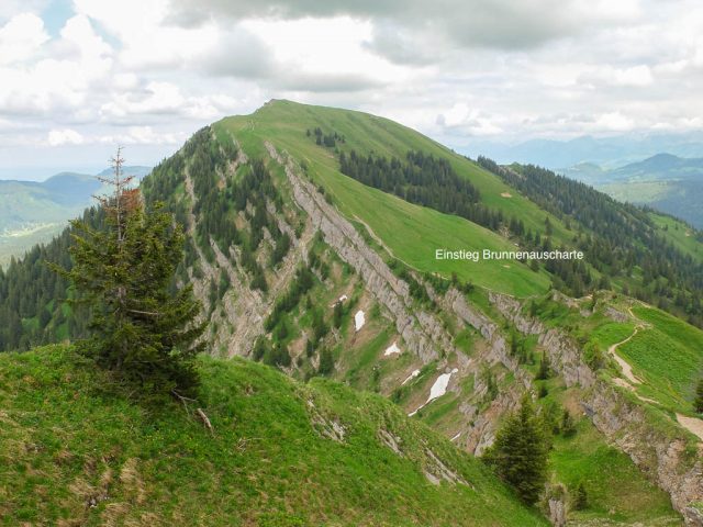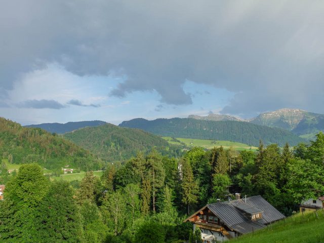 Im Hintergrund ist ein Teil der Churfirsten zu sehen. Die markante Felsspitze, die über dem Haus thront, ist der Frümsel, rechts davon schließen sich Brisi (abgeflacht), Zuestoll und Scheibenstoll an. Links vom Frümsel erstrecken sich die Walenstöcke. Der Vierwaldstättersee an der Tellsplatte, links ist der Gitschen, rechts von ihm im Hintergrund der Uri Rotstock zu sehen: