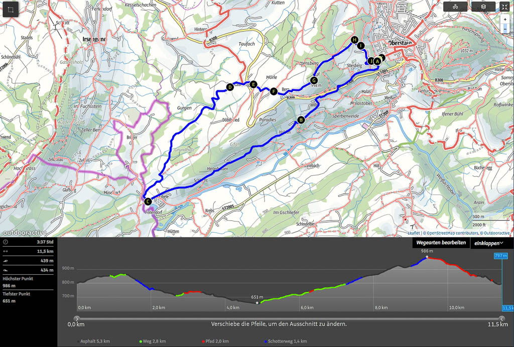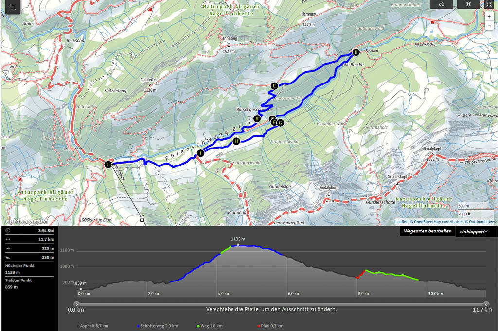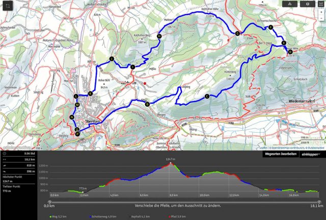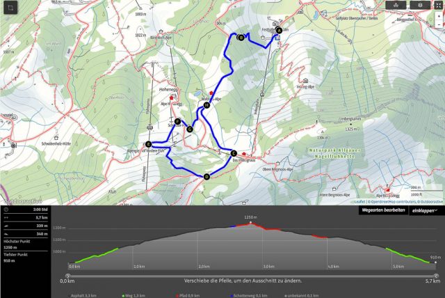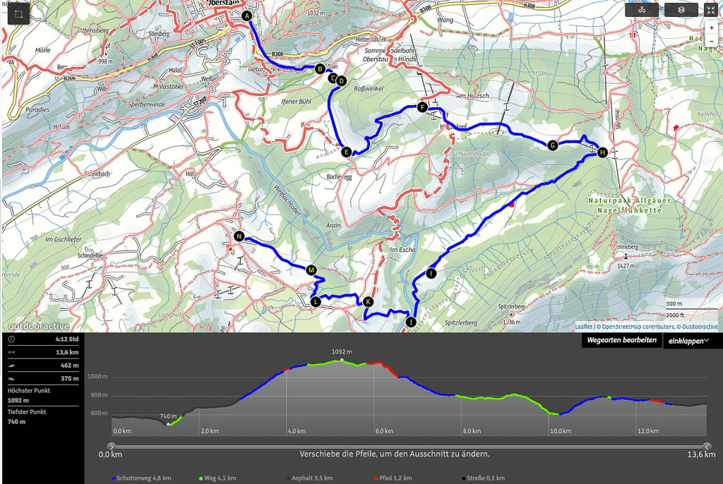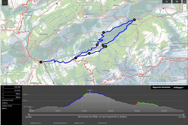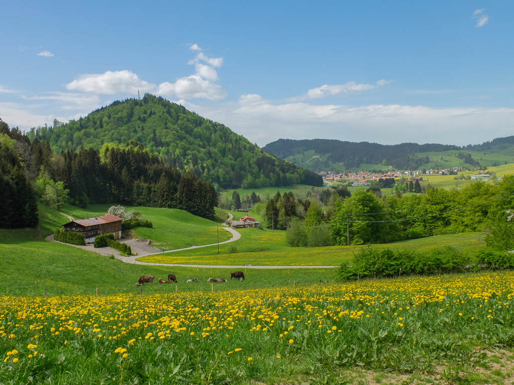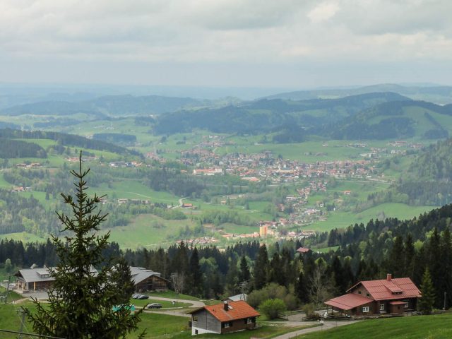 Als Ruhe und Einsamkeit suchender Mensch ist man heute in Oberstaufen Fehl am Platz: Es ist Sonntag, sonnig und es findet ein Historischer Handwerkermarkt statt. Aber auch in der Umgebung sind bei dem schönen Wetter zahlreiche Leute unterwegs und Guido und ich sind lange am Überlegen, wo es vielleicht nicht ganz so voll ist. Wir beschließen schließlich, von Oberstaufen über die Salmaser und Thaler Höhe nach Immenstadt zu laufen und von dort aus mit dem Zug zurückzufahren. Auf der Salmaser Höhe herrscht allerdings ein ziemlicher Trubel, daher ändern wir unseren Plan kurzfristig und wandern über die Kalzhofner Höhe zurück. Die Strecke in der Übersicht:
