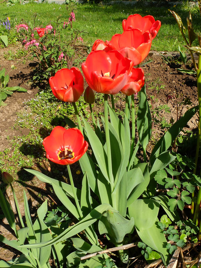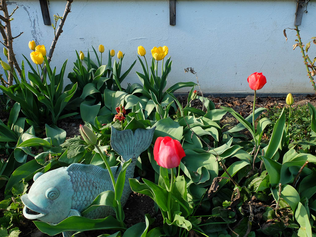 Auch heute wieder bin ich vor dem Dienst im Fitnessstudio im Garten aktiv. Die Tulpenblüte hat mittlerweile ihren Höhepunkt erreicht, gelbe und rote Blüten leuchten um die Wette: