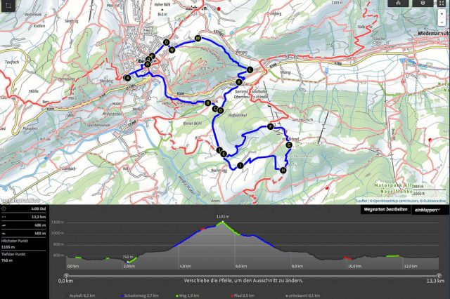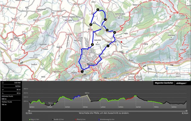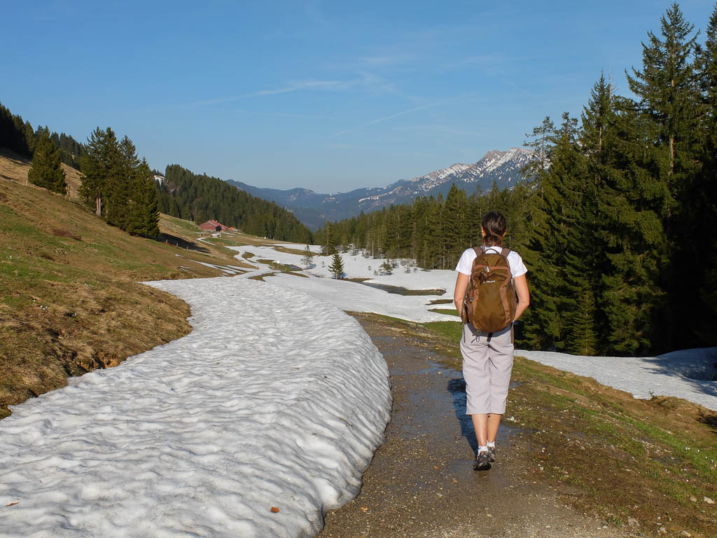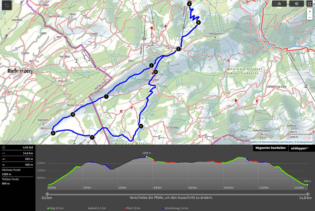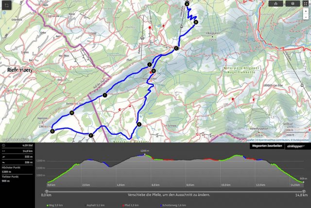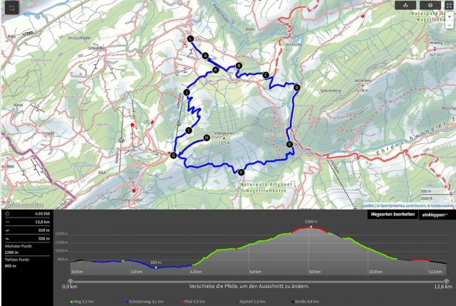 Am Nachmittag geht es wie gestern wandern, heute sind wir allerdings zu viert unterwegs: Eine langjährige Freundin, wir kennen uns seit der 7. Schulklasse, macht zusammen mit ihrem Mann ein paar Tage Urlaub in Oberstaufen bzw. Steibis. Neben meiner Freundin zu spazieren und zu reden, fühlt sich fast wie in alten Zeiten an, als wir während den großen Pausen rund um unsere Schule spaziert sind! Unsere Strecke in der Übersicht: