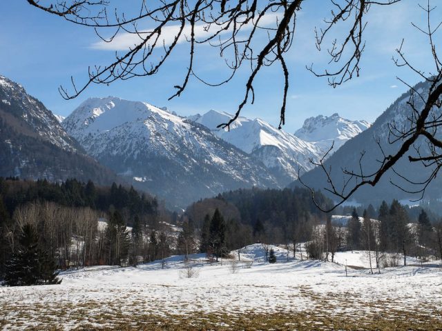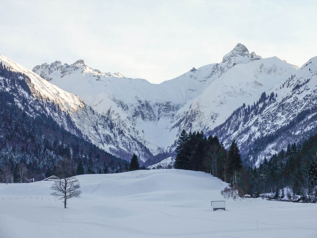 Der Blick auf Kratzer und Trettachspitze vom Gasthof Riefenkopf aus: