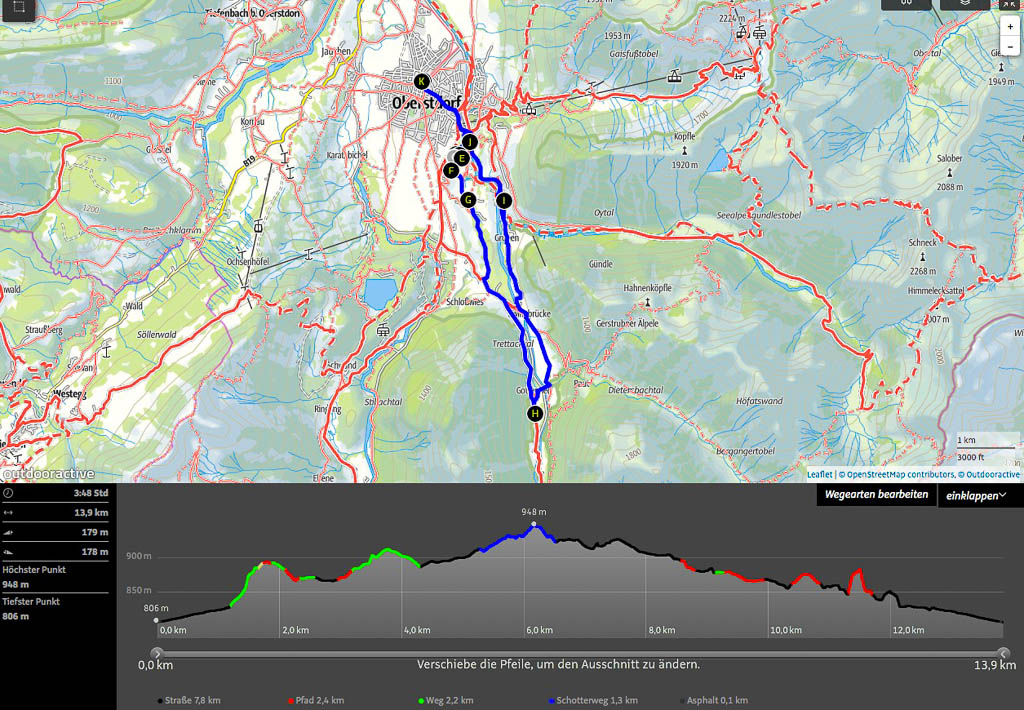 Wir haben heute herrliches, sonniges Winterwetter, das eigentlich perfekt für eine Skitour geeignet ist. Aber der Husten ist immer noch nicht weg, so dass ich von der Idee, auf Skitour zu gehen, lieber Abstand nehme. Allzu viel kalte Luft will ich meinen Bronchien dann doch nicht zumuten! Aber eine Wanderung durch die herrliche Winterlandschaft ist ebenso reizvoll wie eine Skitour, vor allem, wenn man sich so ein schönes Ziel aussucht wie den Christlesee bei Oberstdorf. Guido und ich starten um 14.00 Uhr vom Bahnhof in Oberstdorf aus und um 16.50 Uhr sind wir pünktlich zur Abfahrt des Zuges Richtung Heimat wieder zurück. Die Strecke in der Übersicht: