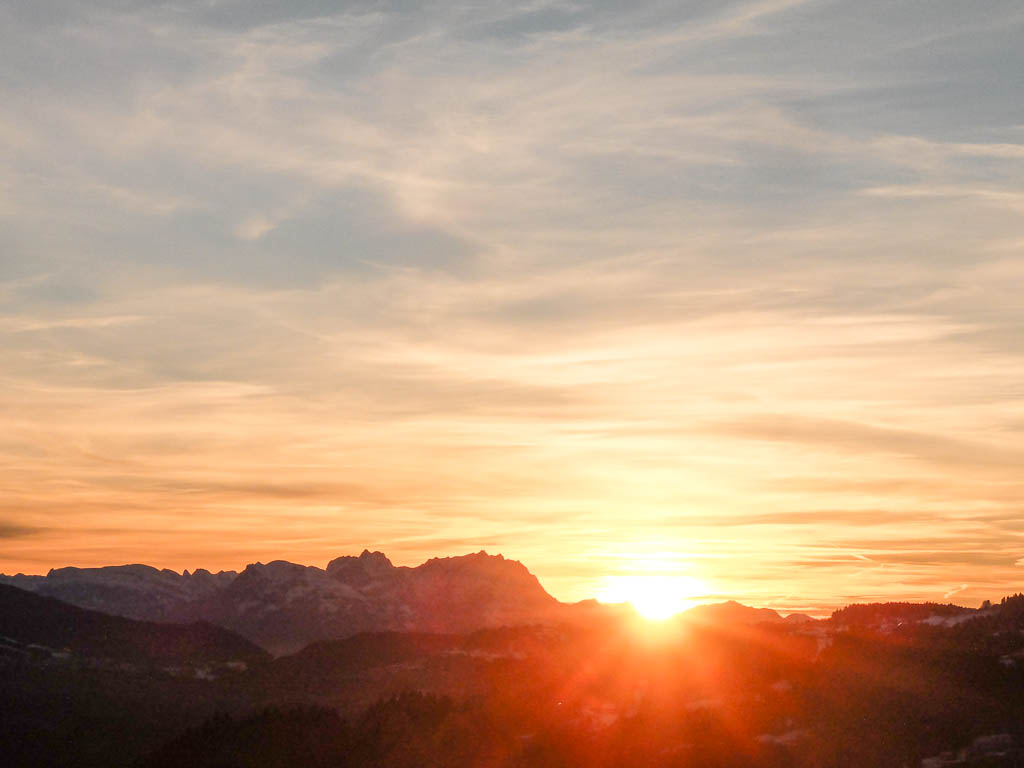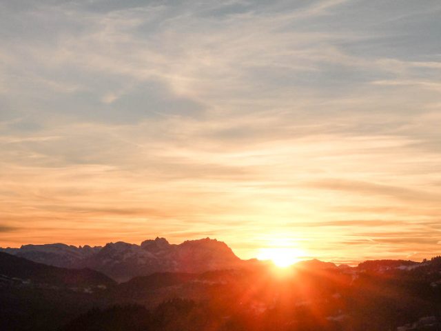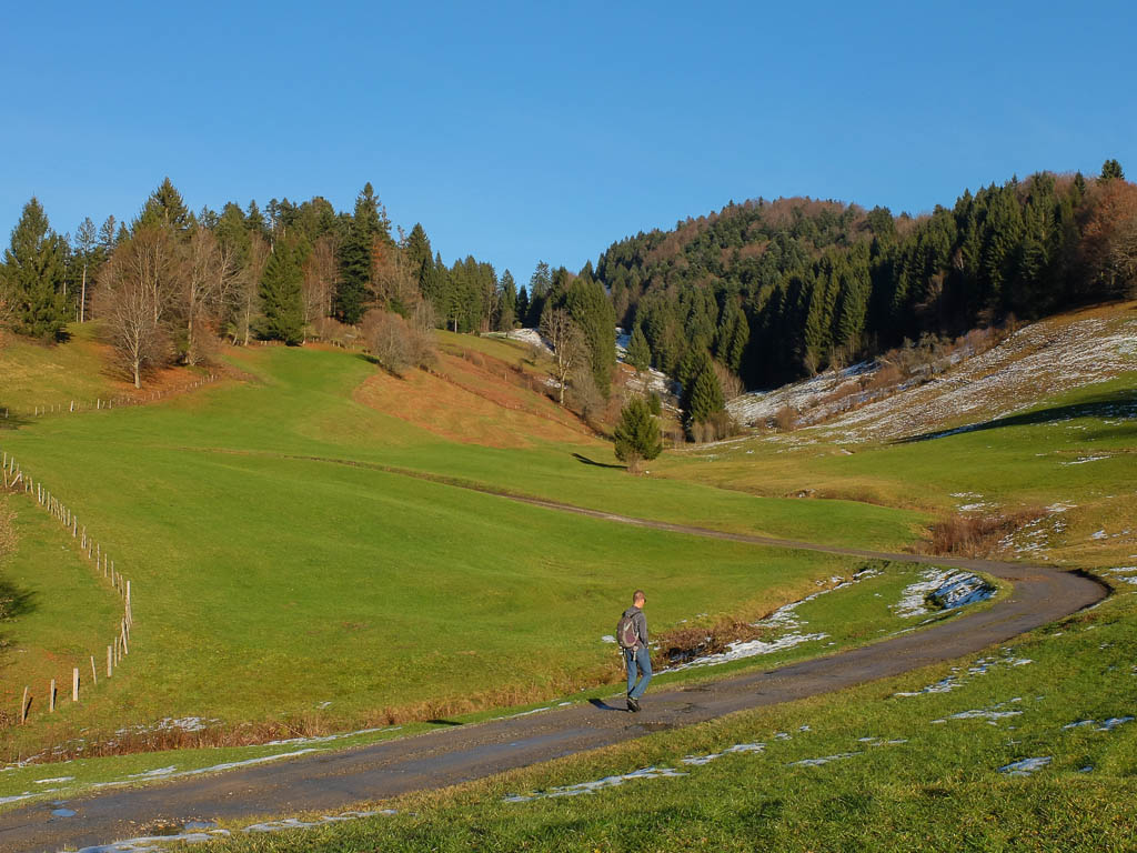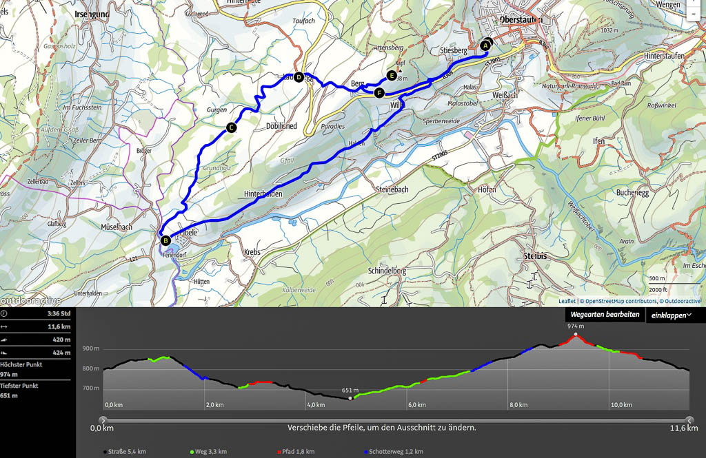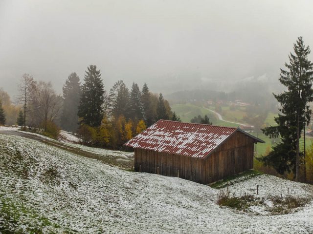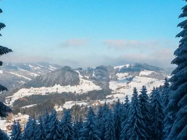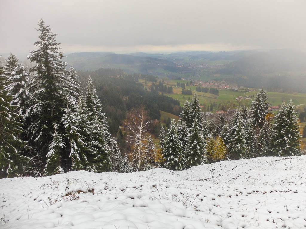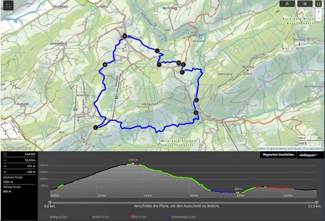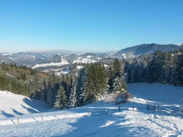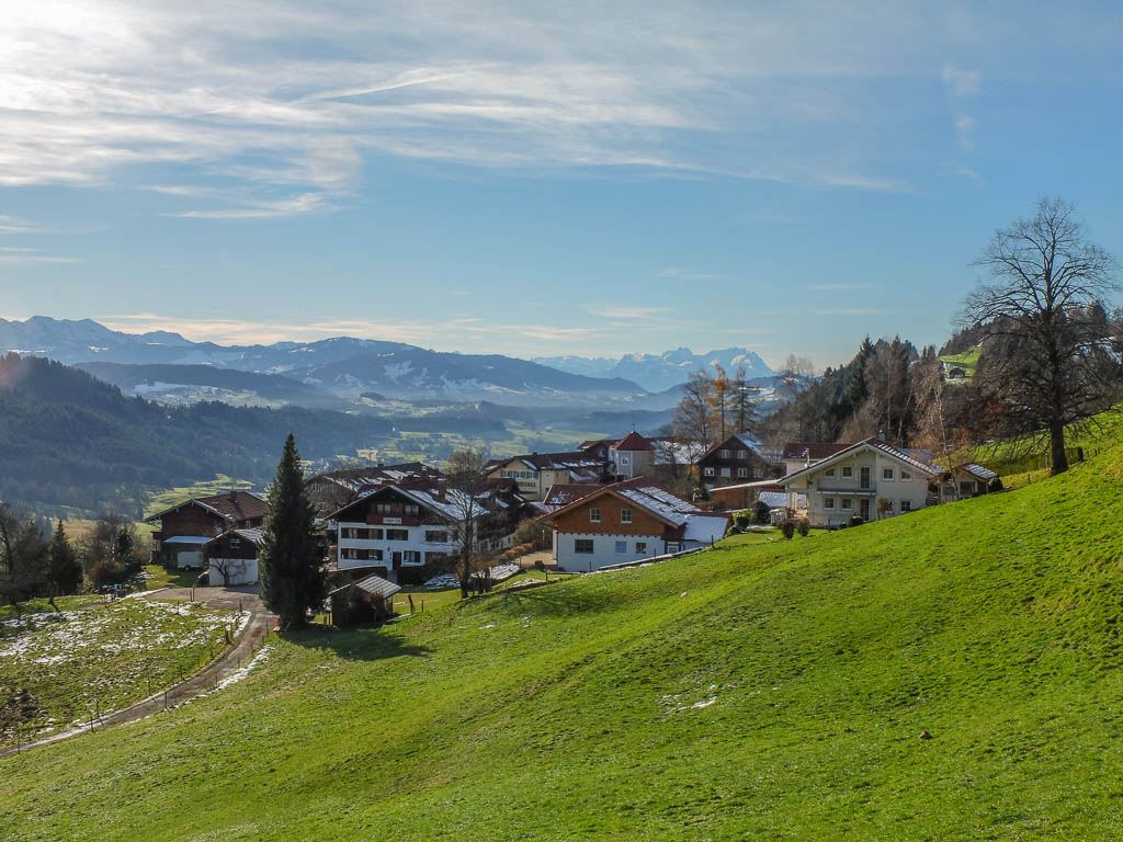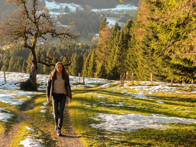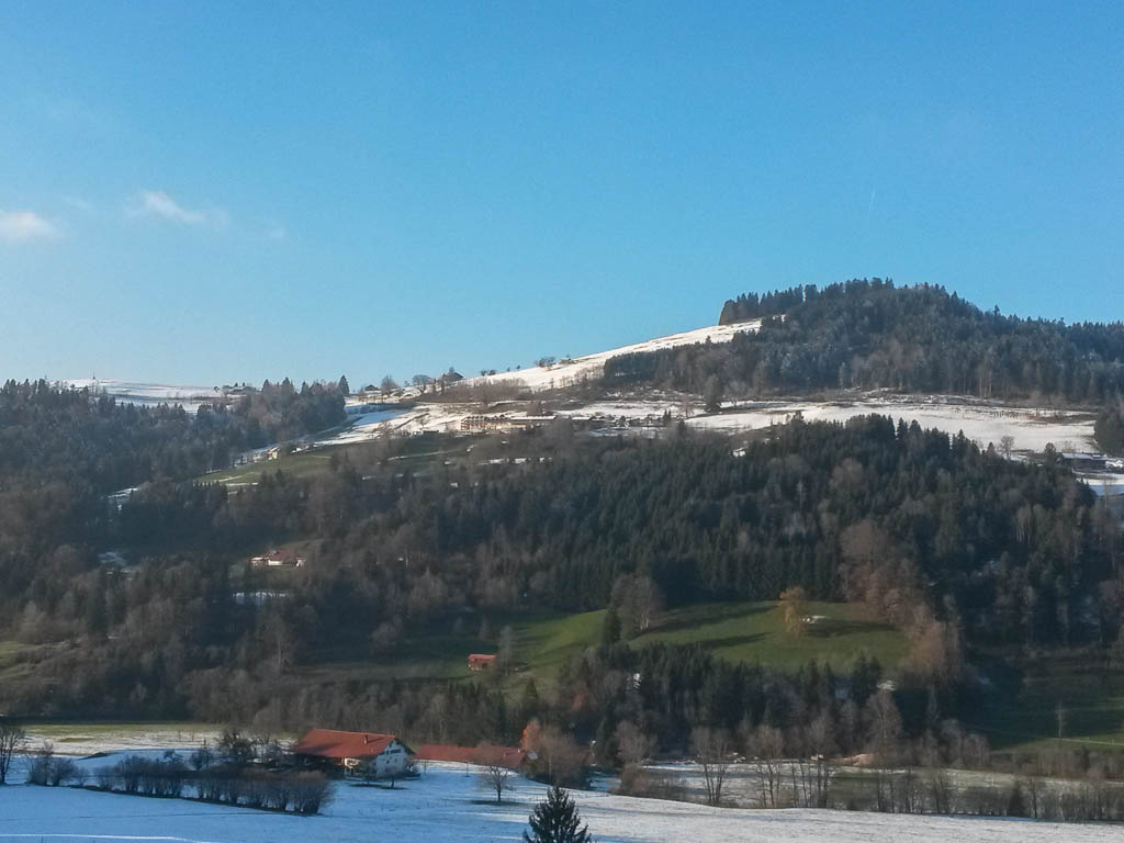 Unsere Skitour am Sonntag war wohl die erste und gleichzeitig die letzte für die nächste Zeit. Bei Temperaturen um die 14 °C und strahlendem Sonnenschein sind die Hänge am Imberg mittlerweile nicht mehr befahrbar. Statt mit den Skiern sind wir heute daher wieder einmal mit den Wanderschuhen unterwegs: Wir laufen mit der Sonne im Gesicht nach Eibele an der österreichischen Grenze und mit der Sonne im Rücken über Laufenegg sowie Berg hinauf zum Kapf. Dort genießen wir den Sonnenuntergang, dann geht es zurück nach Hause. Der Tourenplaner von outdooractive.com gibt für die Strecke eine Länge von 11,6 Kilometern an: